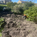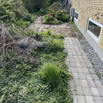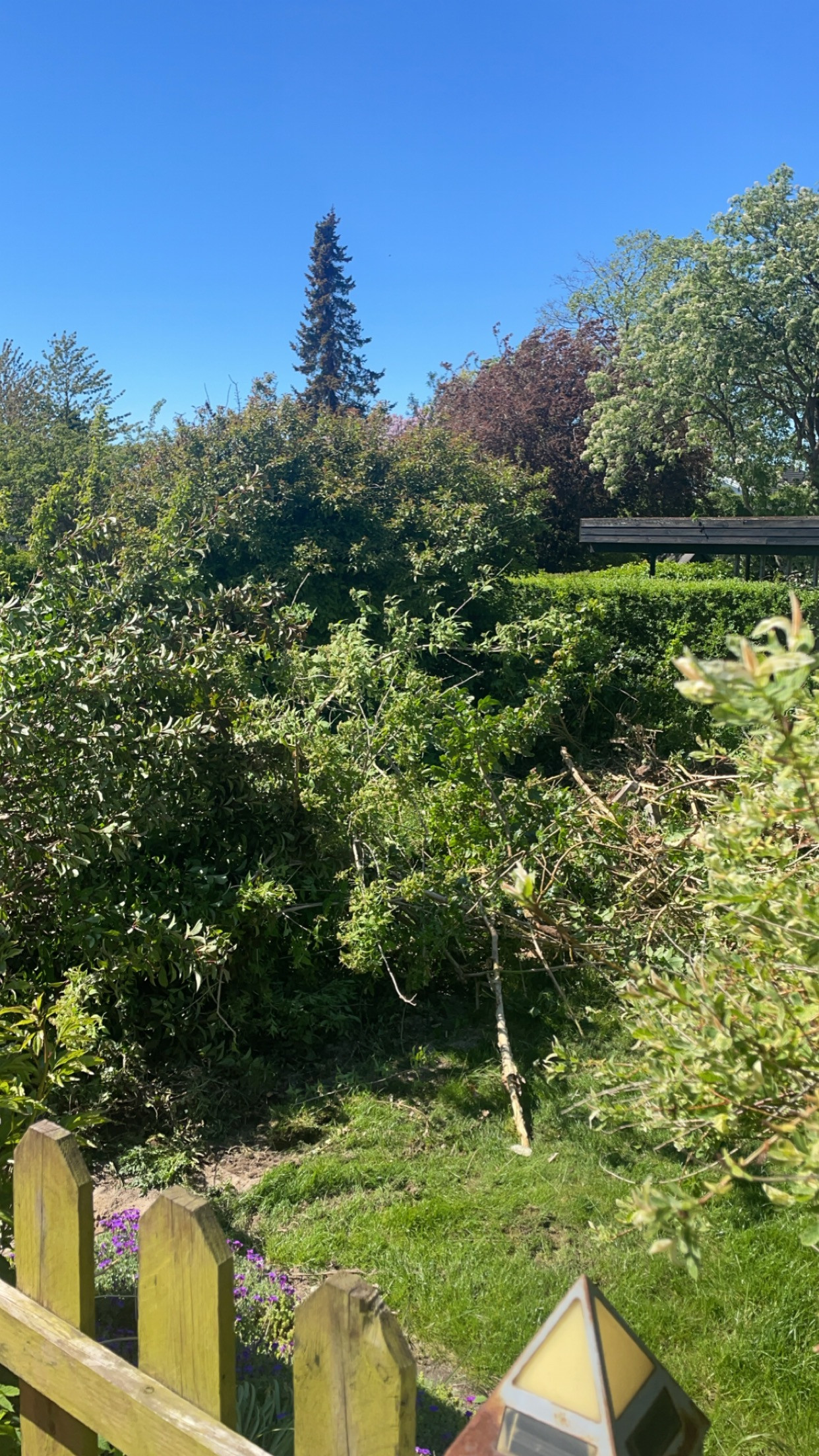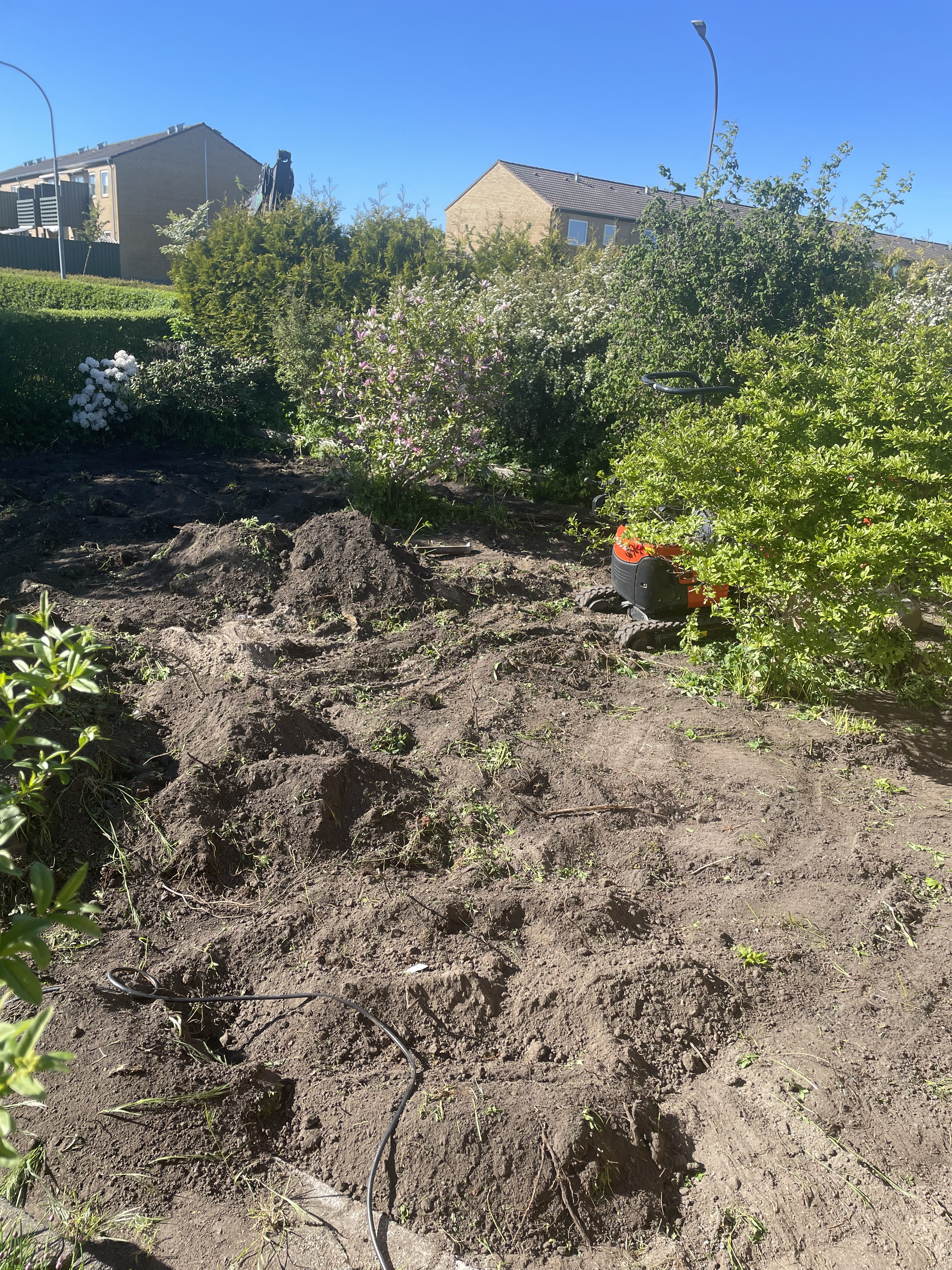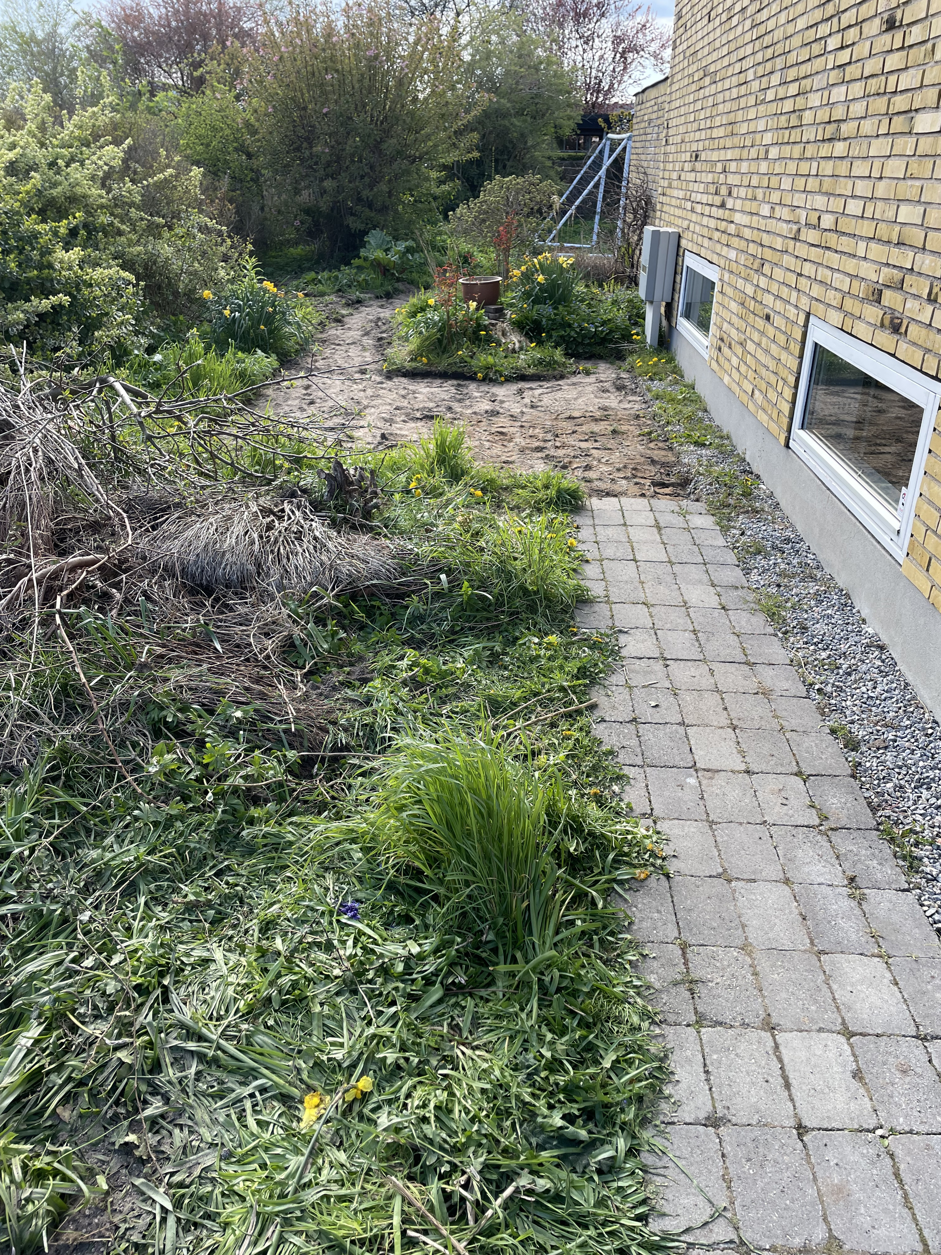 Vi har fået bortskaffet en stor jordbunke og en del grus, planeret jorden og sået græs. Træer er fældet, buske fjernet og flere træer beskåret.