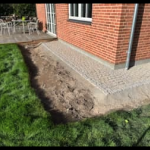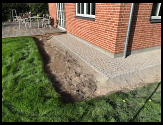 Opgaven var at bortskaffe gamle beton fliser, etablere ny bund og lægge fliser på ca. 40kvm.