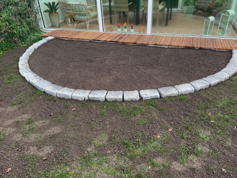 Terræn hæves med genbrugsstabil og derefter udlægning af fliser.