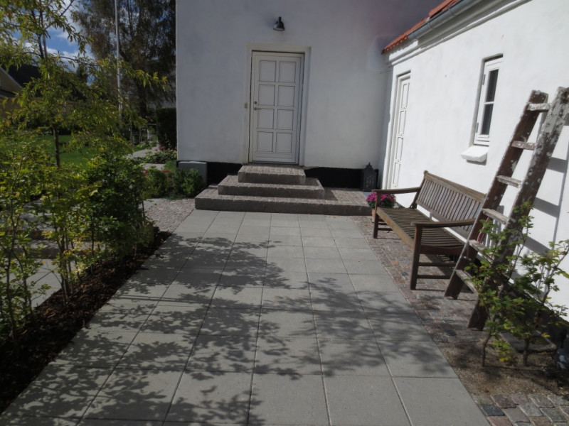 Lagt nyt slotsgrus i indkørsel. Hævet fliser der havde sat sig. Plantet sydbøg i stedet for gammel der var væltet i storm.