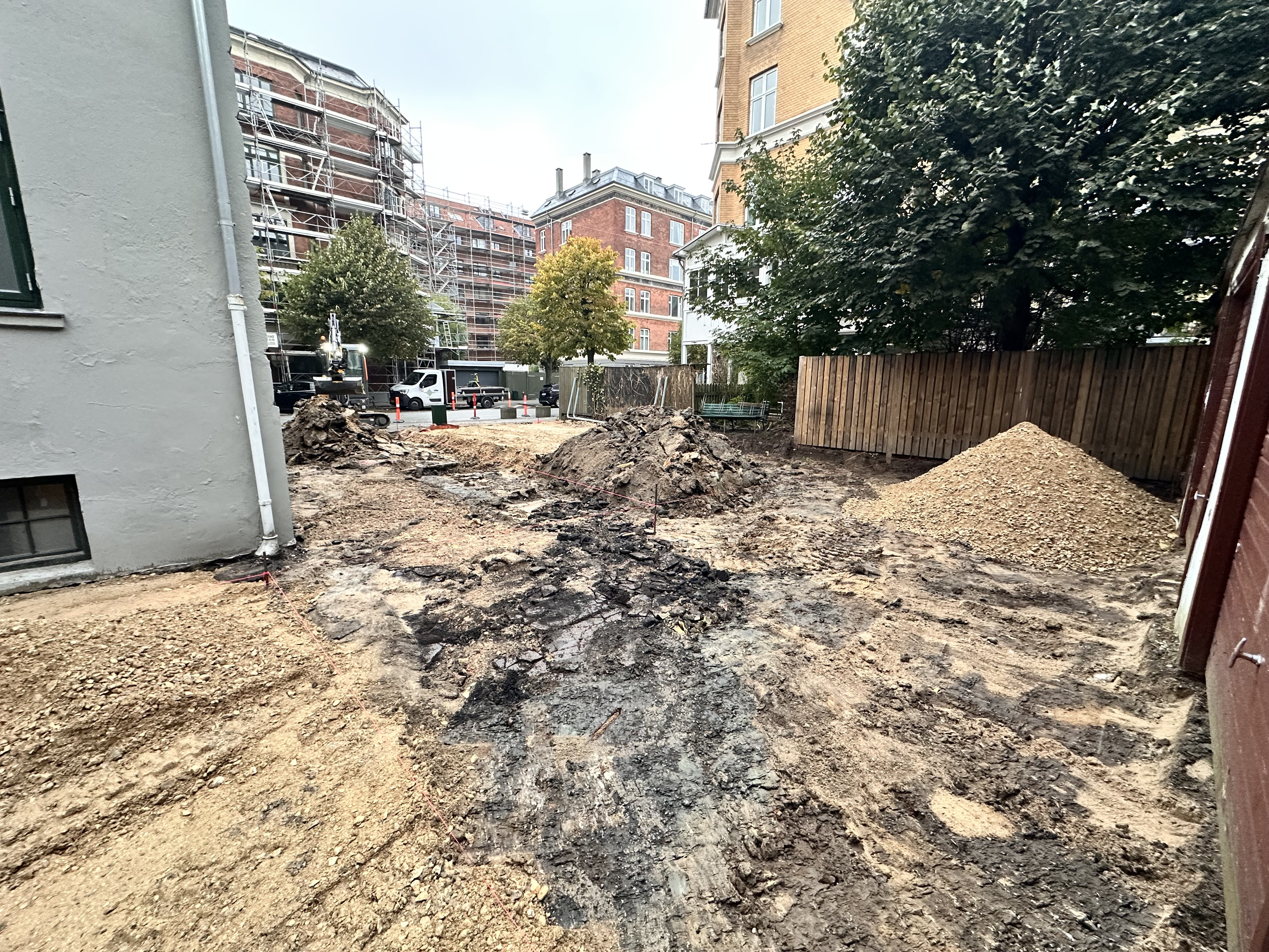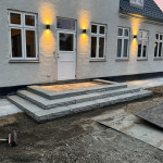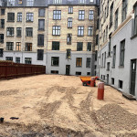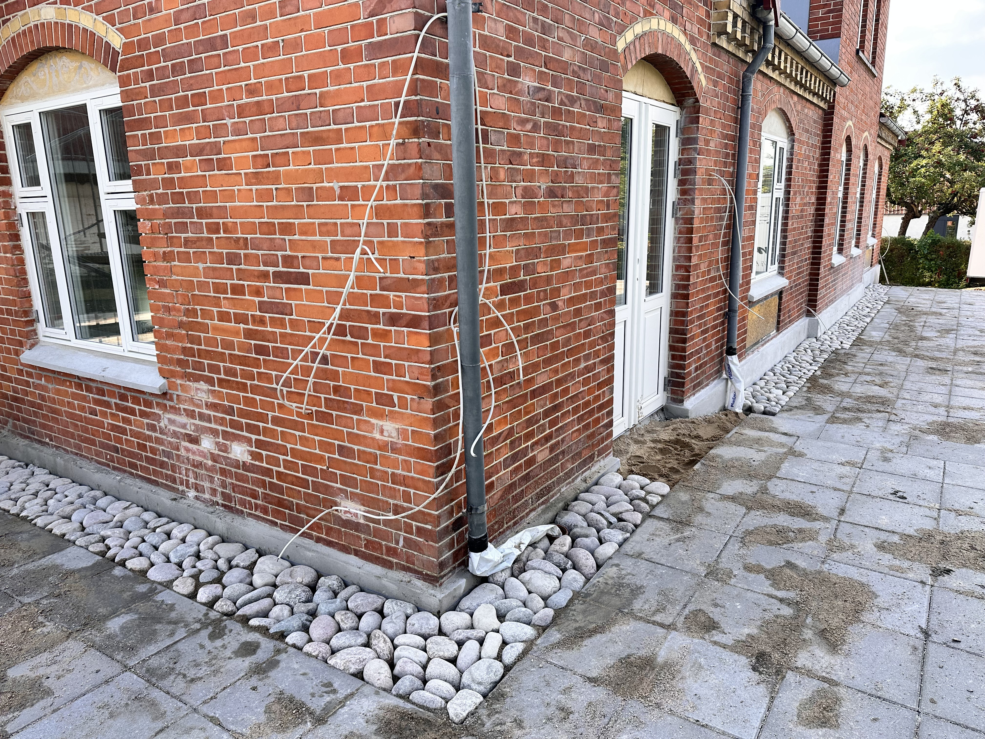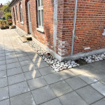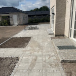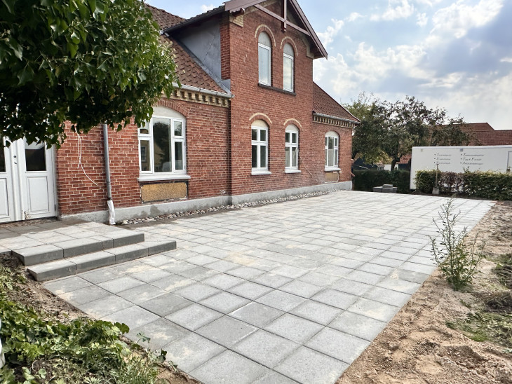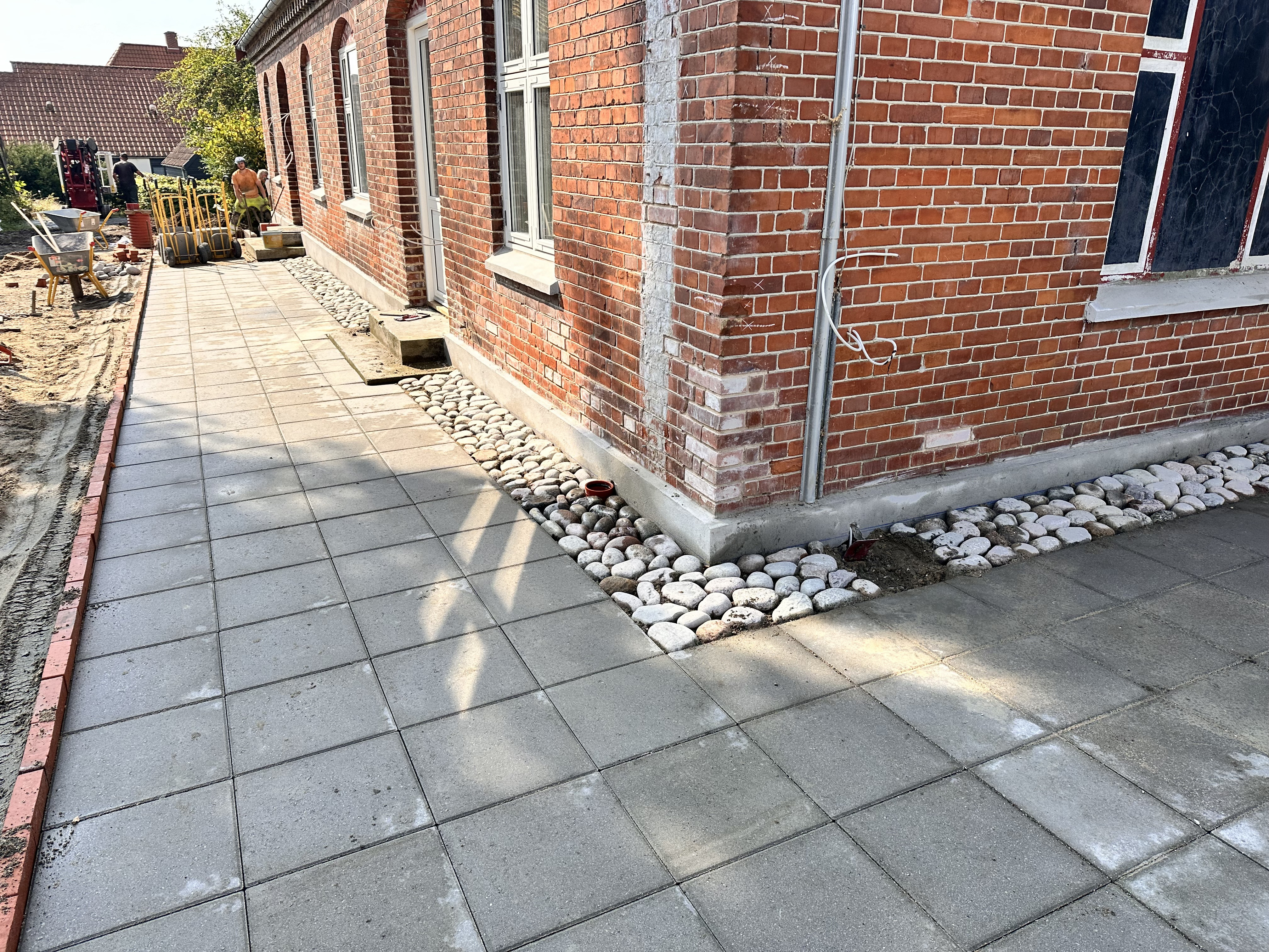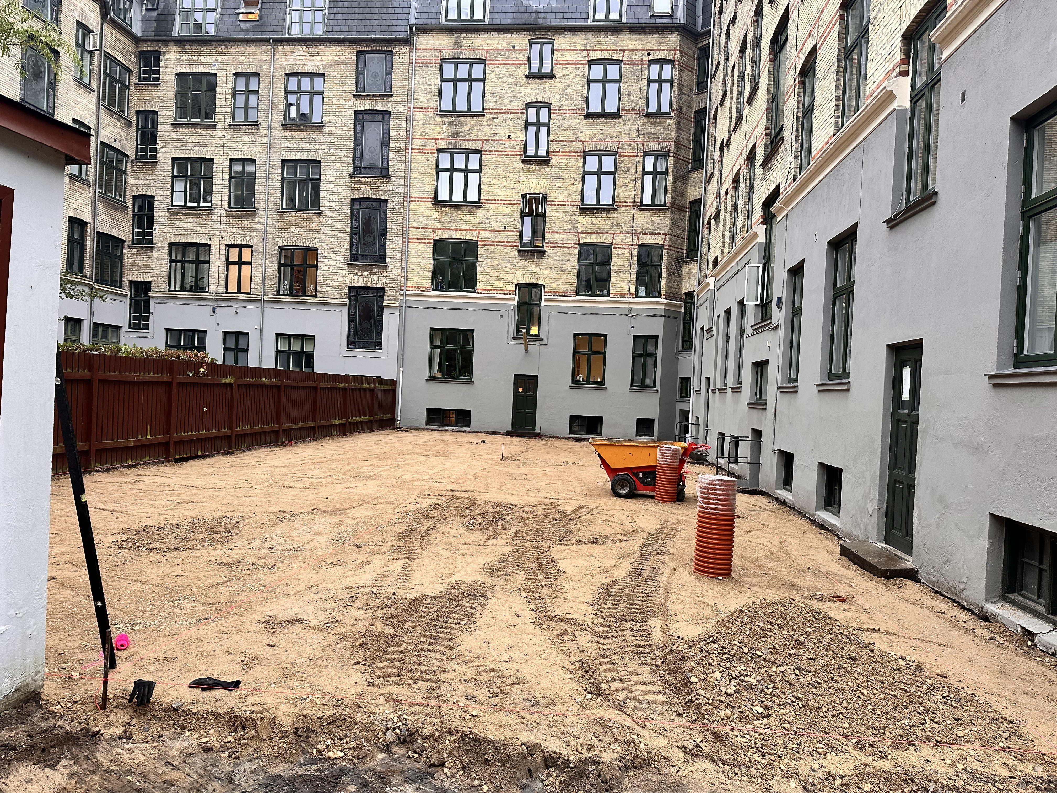 Større opgave omkring ny flisebelægning i gård på Frederiksberg. Inden igangsætning var der asfalt og stort grønt område. Nye afvandings brønde etableres.