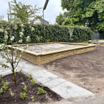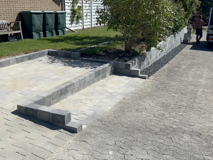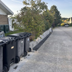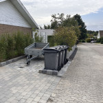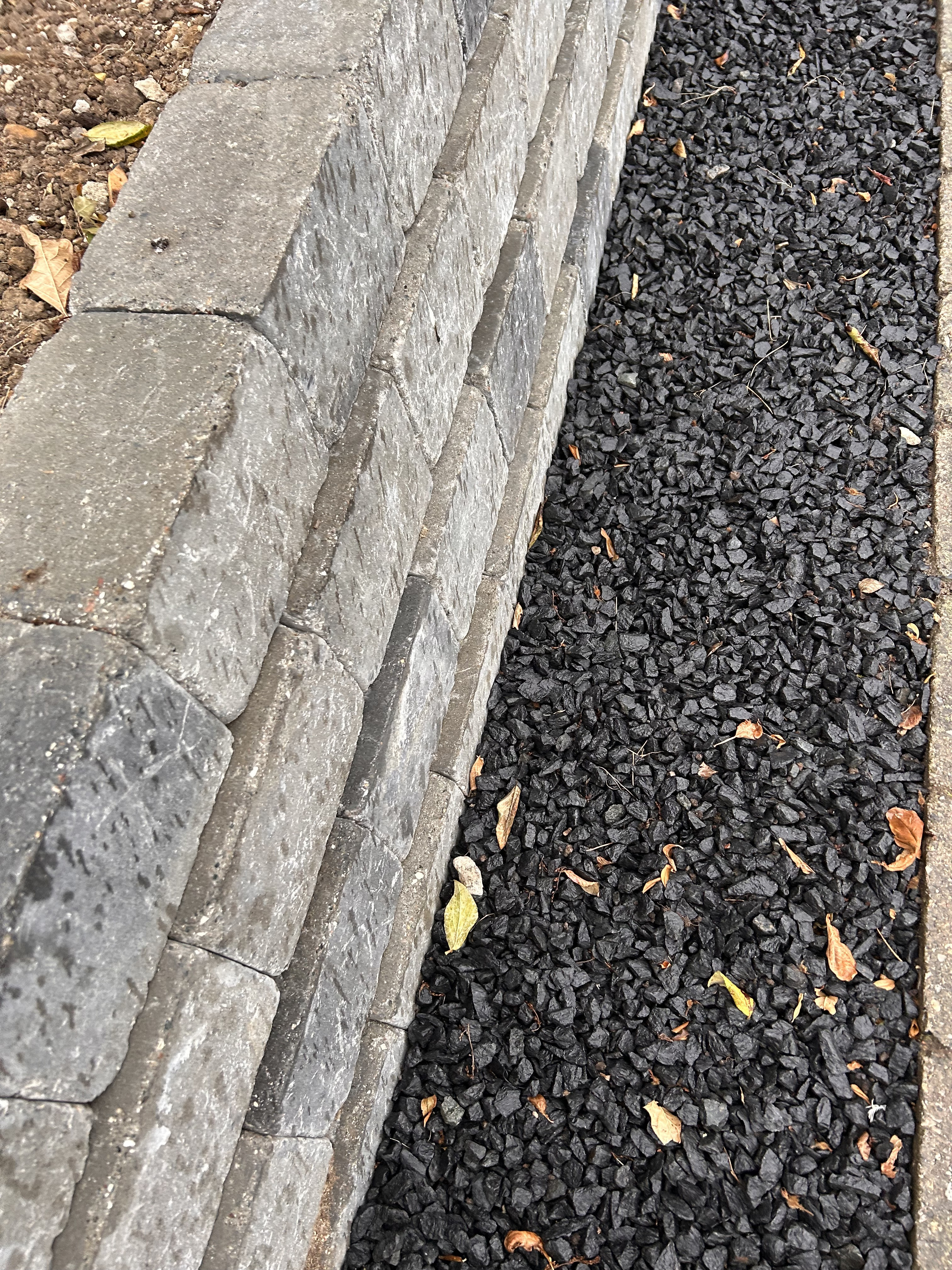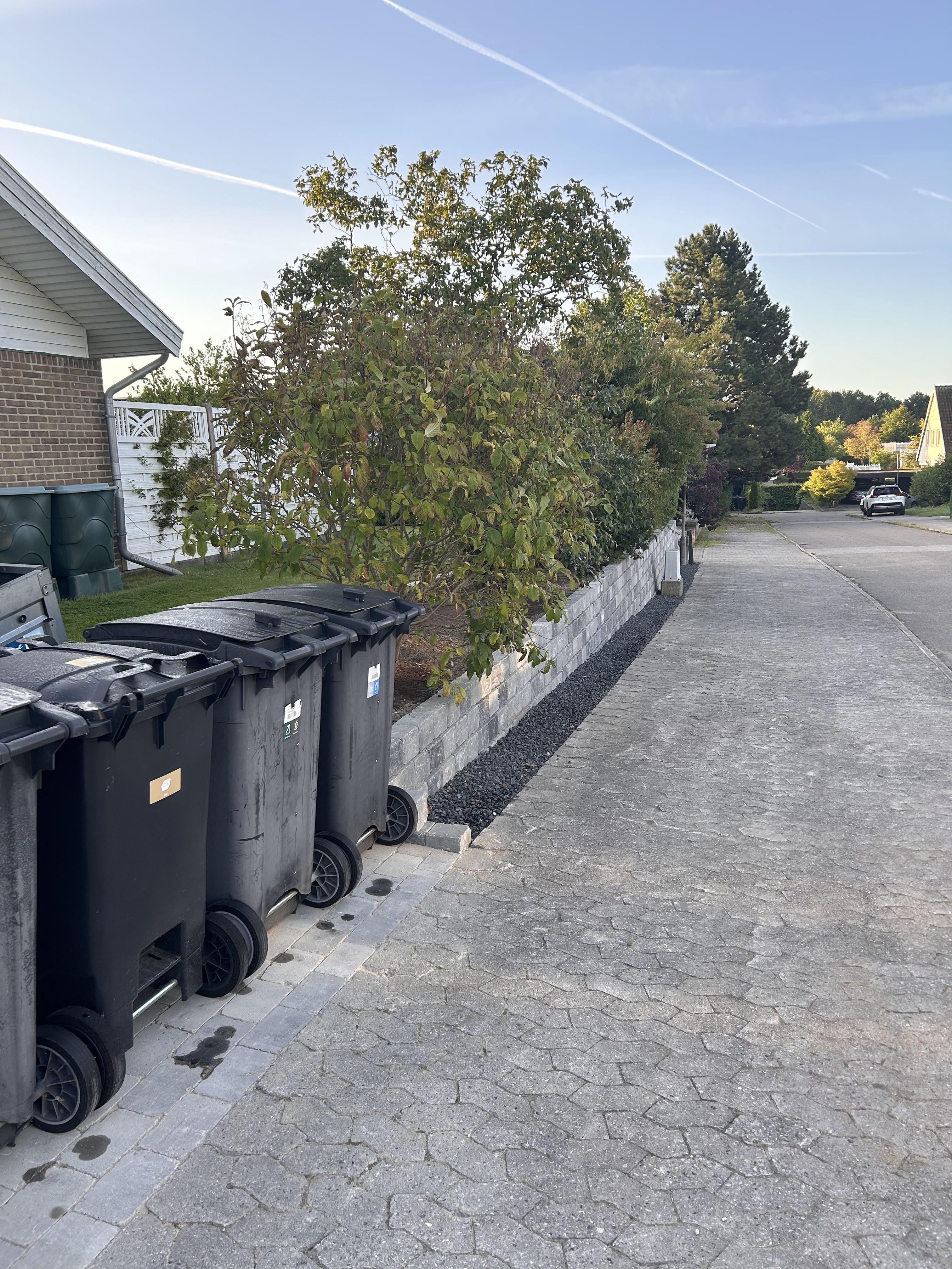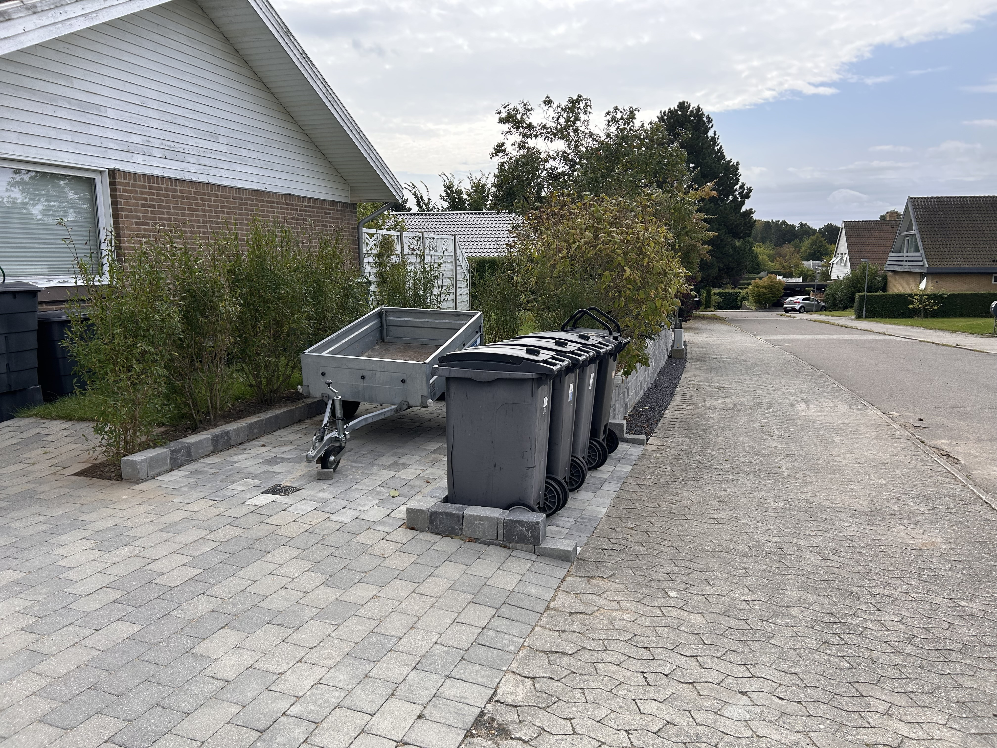 Pro-anlæg renoverede vores 70’er støttemur som skulle følge vores lidt buet vej. Der blev lavet et indhak til de umulige skraldespande og en trailer plads, med hæk omkring. Alt sammen i tråd med resten af haven.