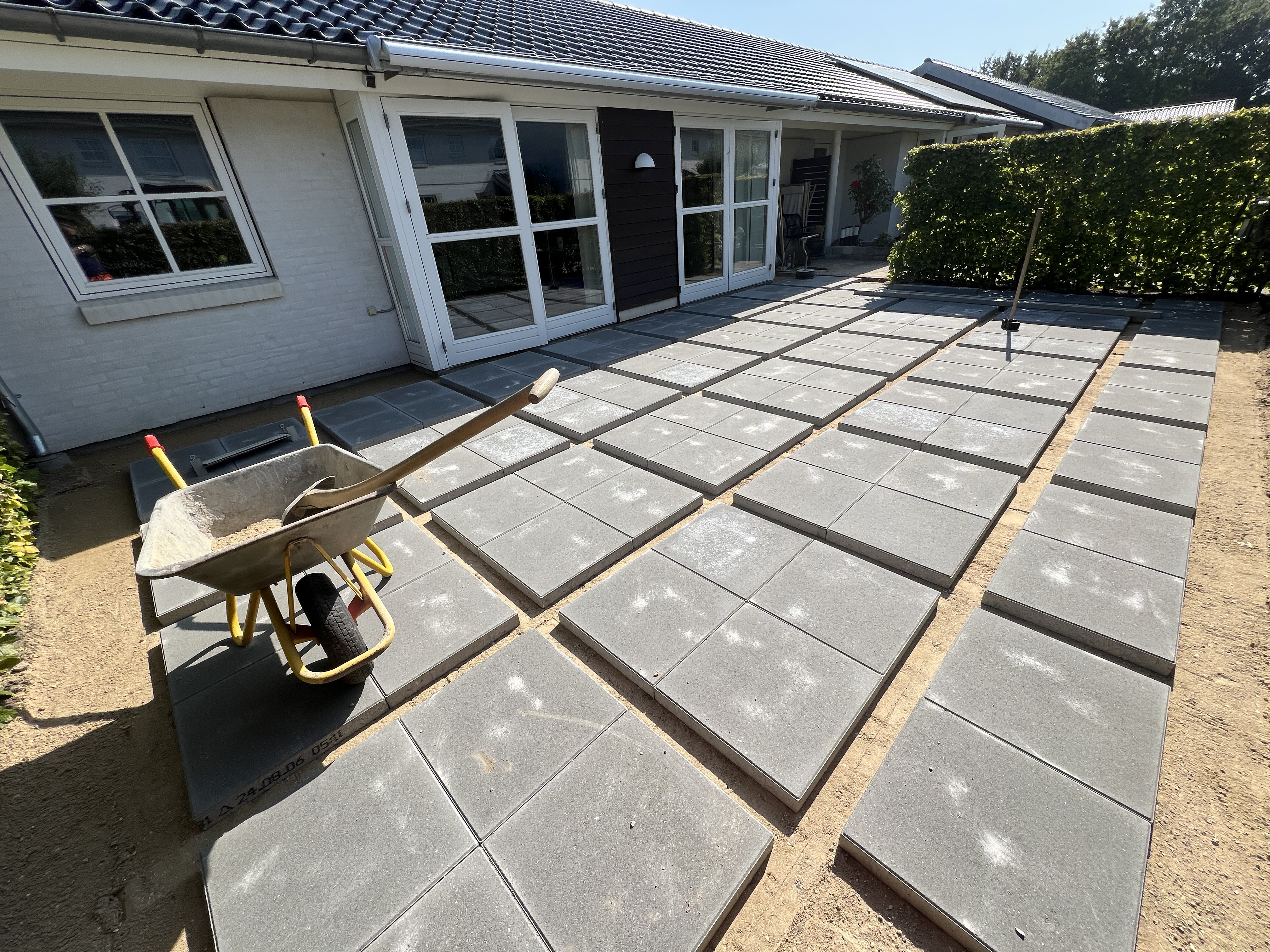 Vi havde Jannik til anlægge ny have med rullegræs, hæk samt træterasse. Herudover fik vi lagt fliser i vores carport og indgang til hus i sildeben.