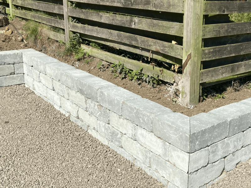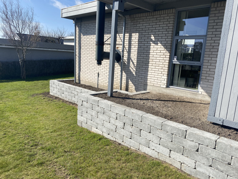 Vi måtte bygge en 40 meter lang støttemur, forlænge vores fortov, bygge fundamentet til et fremtidigt skur med betonpæle og bygge et bålsted med en diameter på 4 meter med chaussesten.