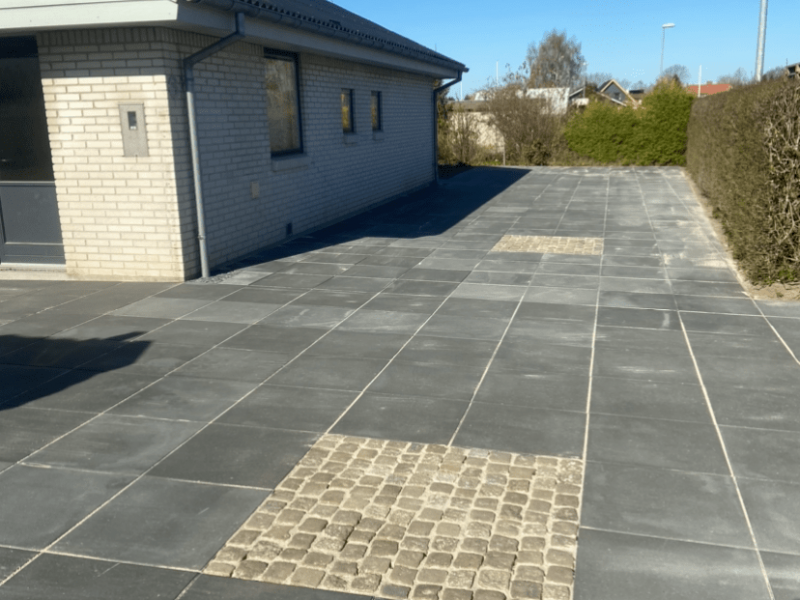 Jacob har lavet et utrolig flot stykke arbejde i vores indkørsel og dobbelcarport. Opmåling og forarbejdet i underlaget under fliserne foretaget meget professionelt og det færdige arbejde