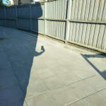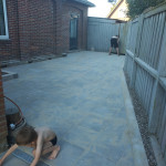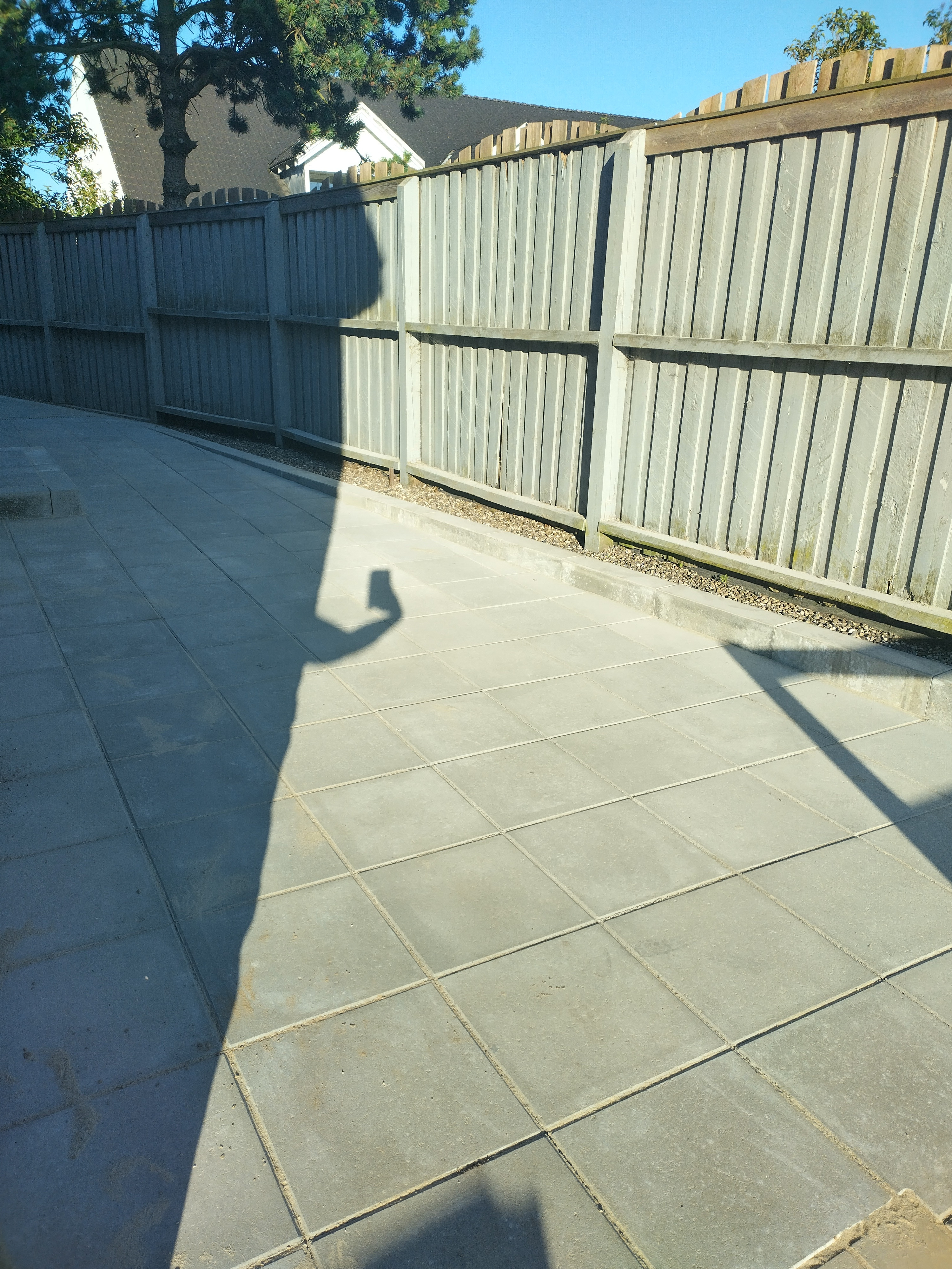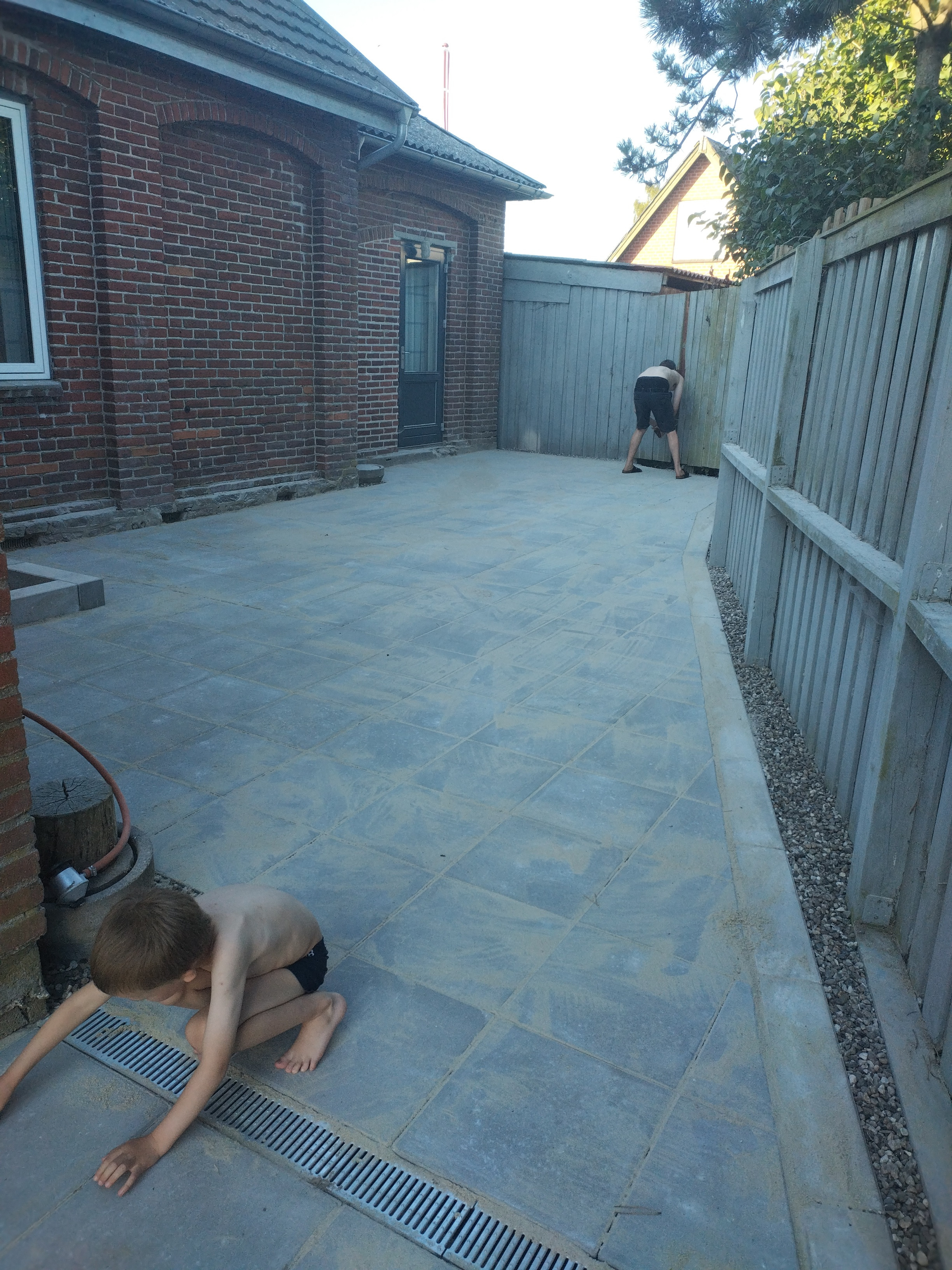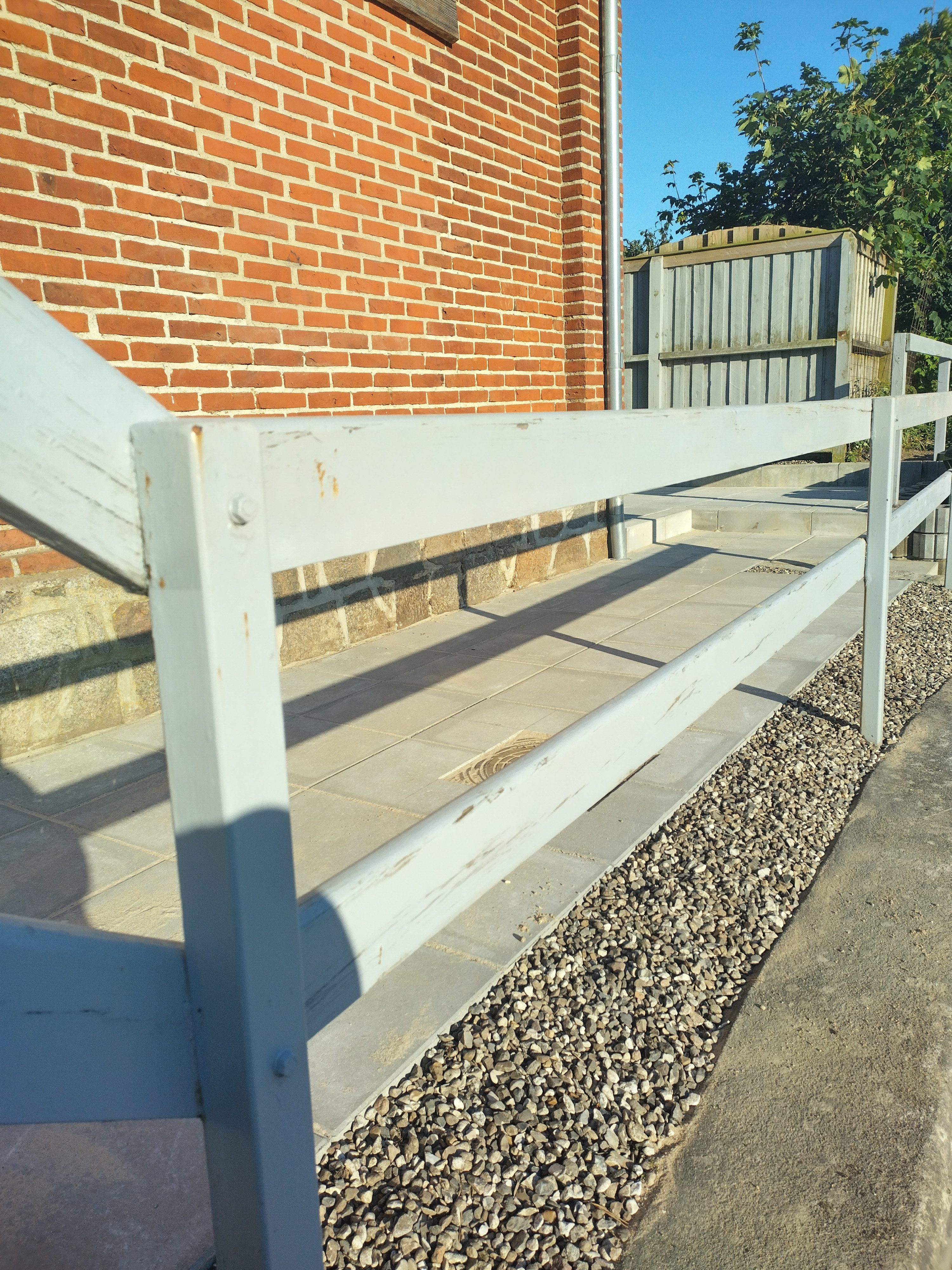 Vi har fået lavet en flisegang rund om huset og med to terrasser.