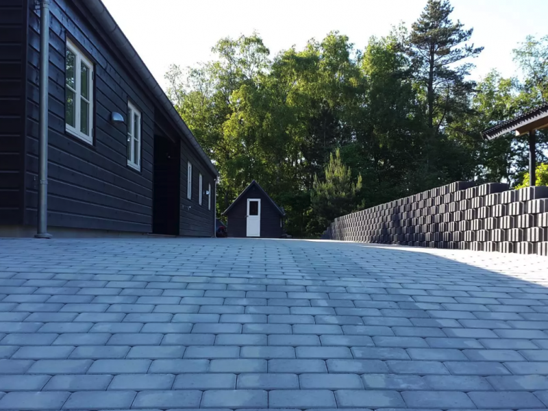 Vi har fået lagt beton fliser i indkørslen, lagt som sildeben. Langs garageporten er der lagt et dræn.