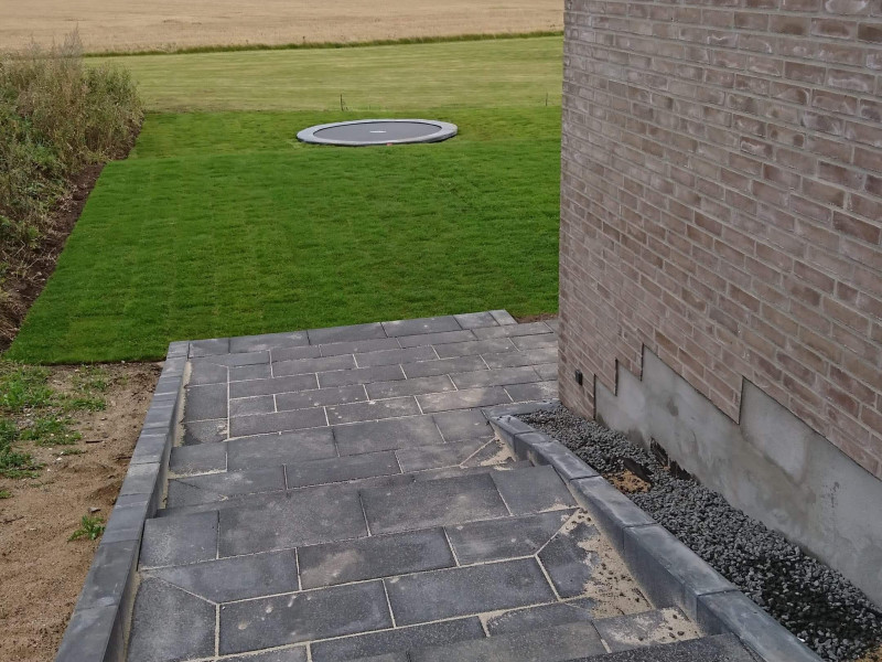 I vores gårdhave er der lagt sandstens fliser, som er opdelt af et stentæppe, der bruges som sti til vores entrédør. Det smarte ved stentæppet er, at det er et dræn, som skal aflede al regnvand fra gårdhaven. Det ser max godt ud samtidig med, at det er funktionelt.
