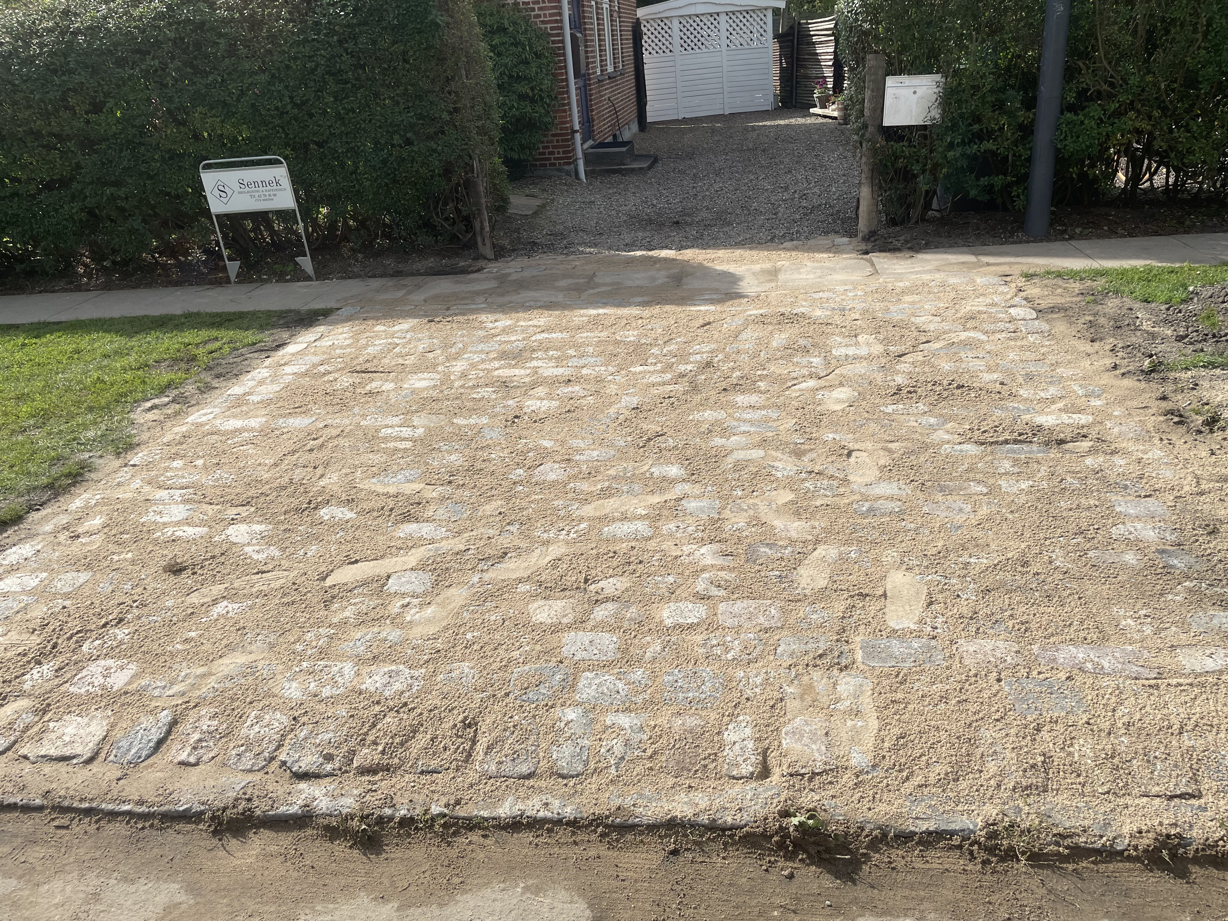 omlægning af indkørsel og gangarealer med chaussesten. - Arbejdet blev udført meget grundigt og omhyggeligt. De to brolæggerer var meget behagelige og beskrev omfanget meget omhyggeligt. Vi er overordentlig tilfredse og vil uden tøven anbefale firmaet til andre.
