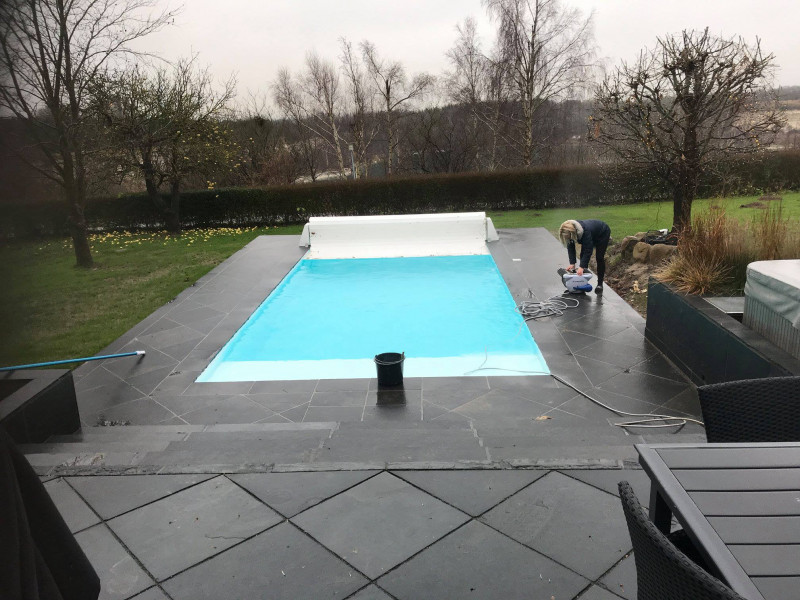 Har fået renoveret vores gamle swimmingpool fra 80’ erne. Banken de gamle fliser ned, pudset op igen og langt liner ind.