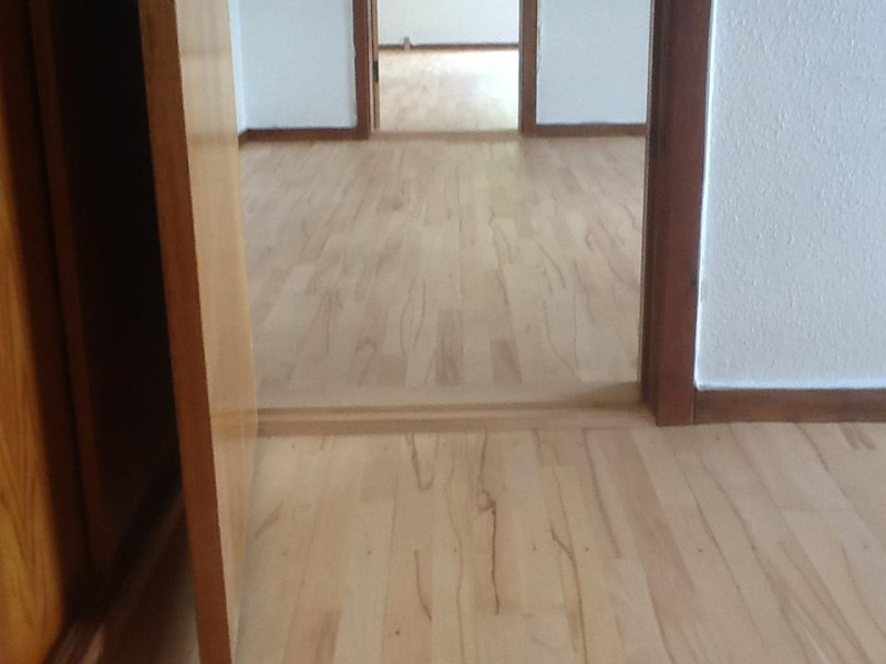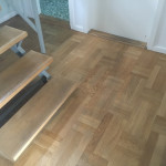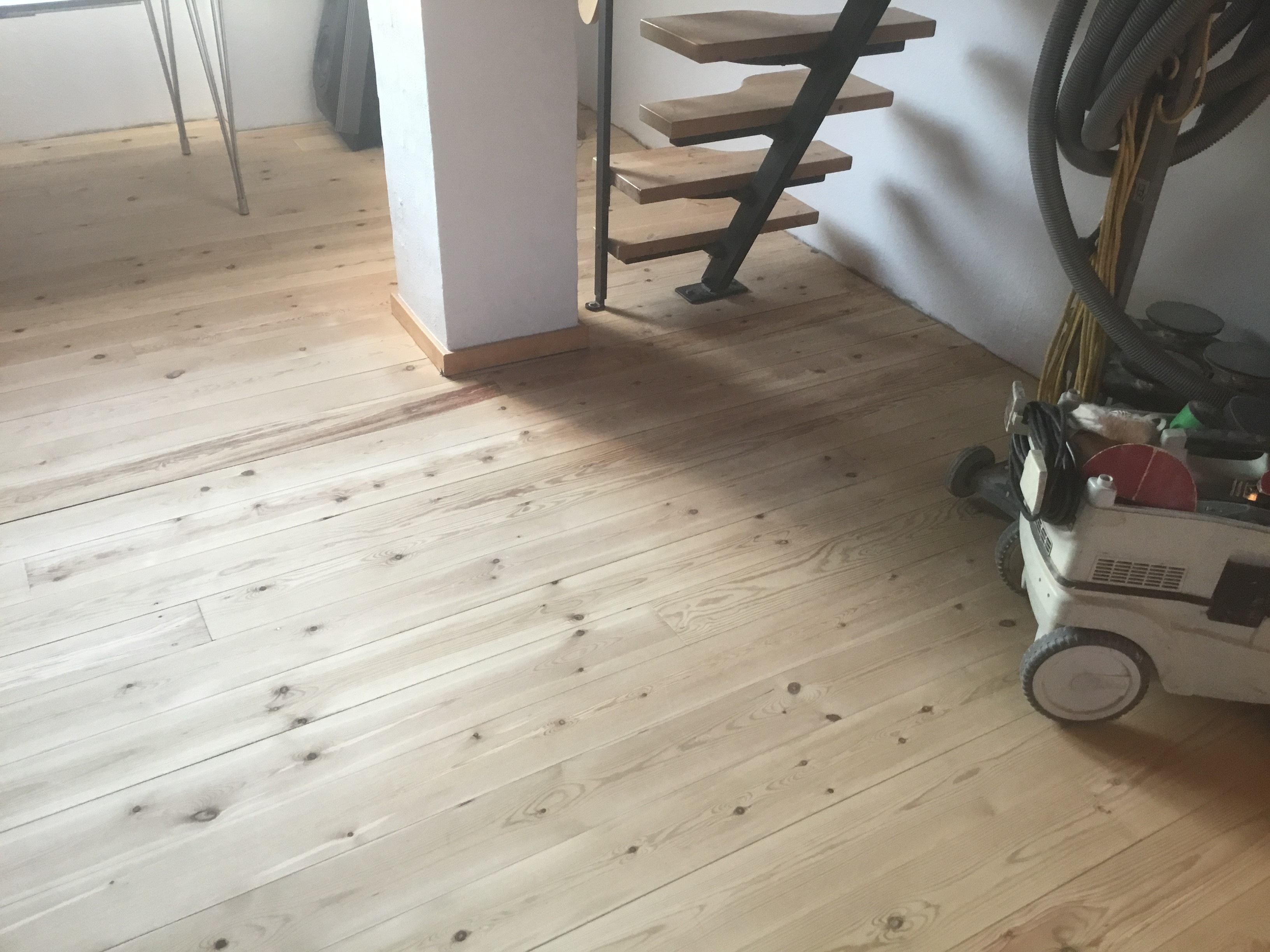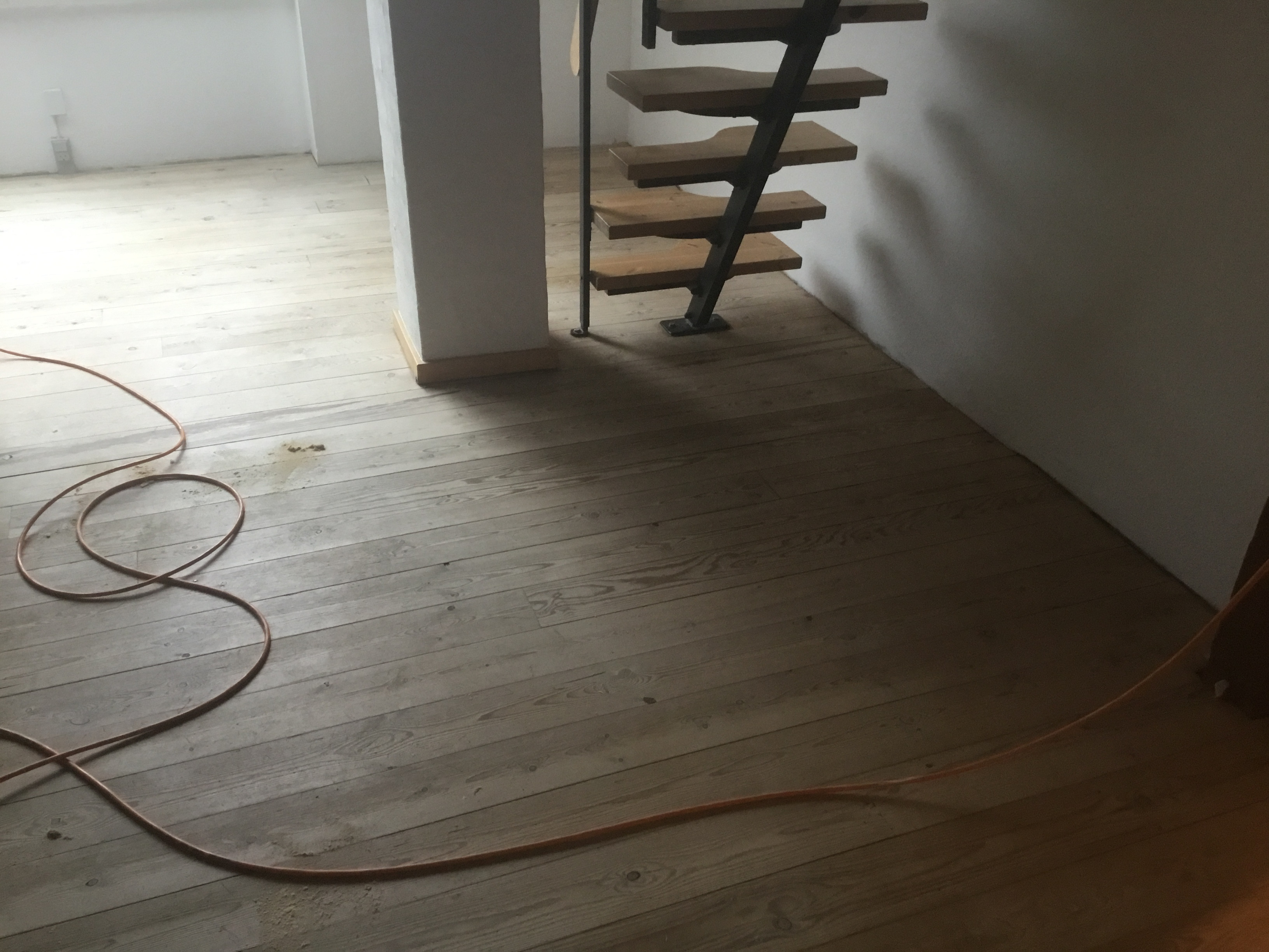 Vi har fået foretaget gulvafslibning og overfladebehandling på gulv 1. sal ( se foto) og trappe til 1. sal samt slebet og olie/voks behandlet køkkenbord og sofabord.