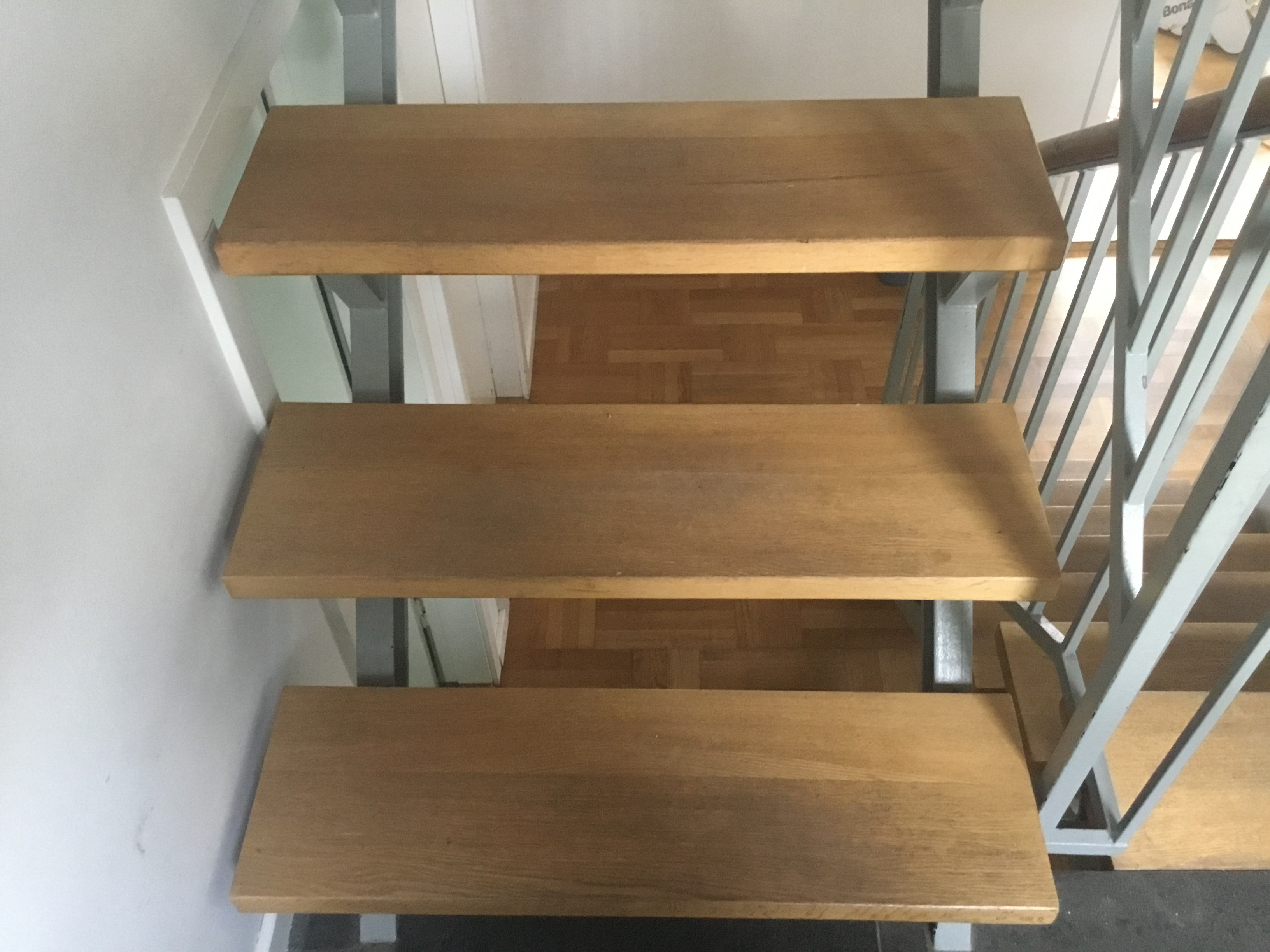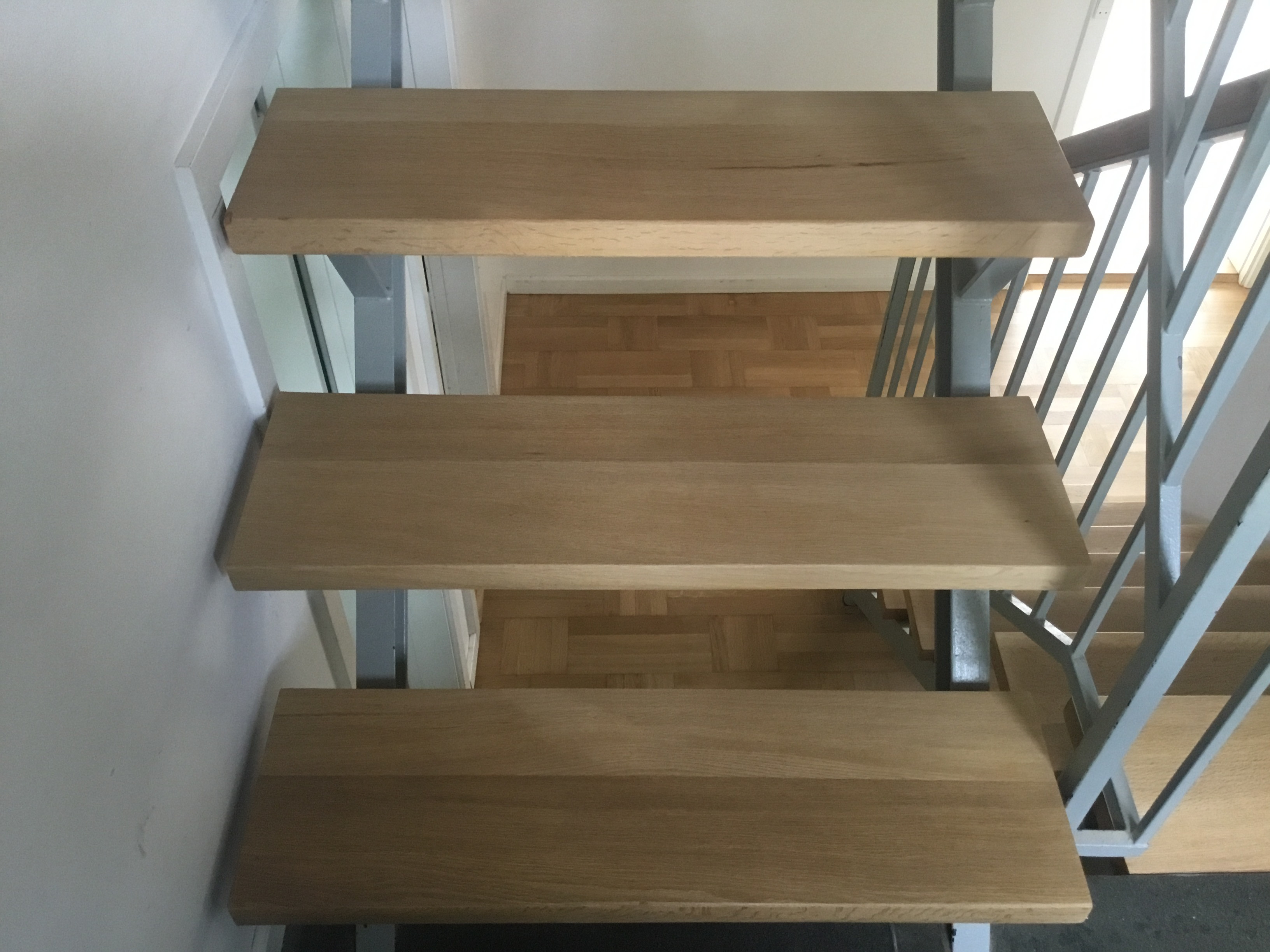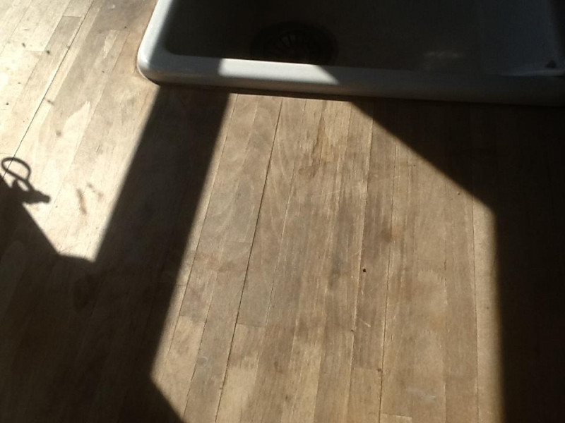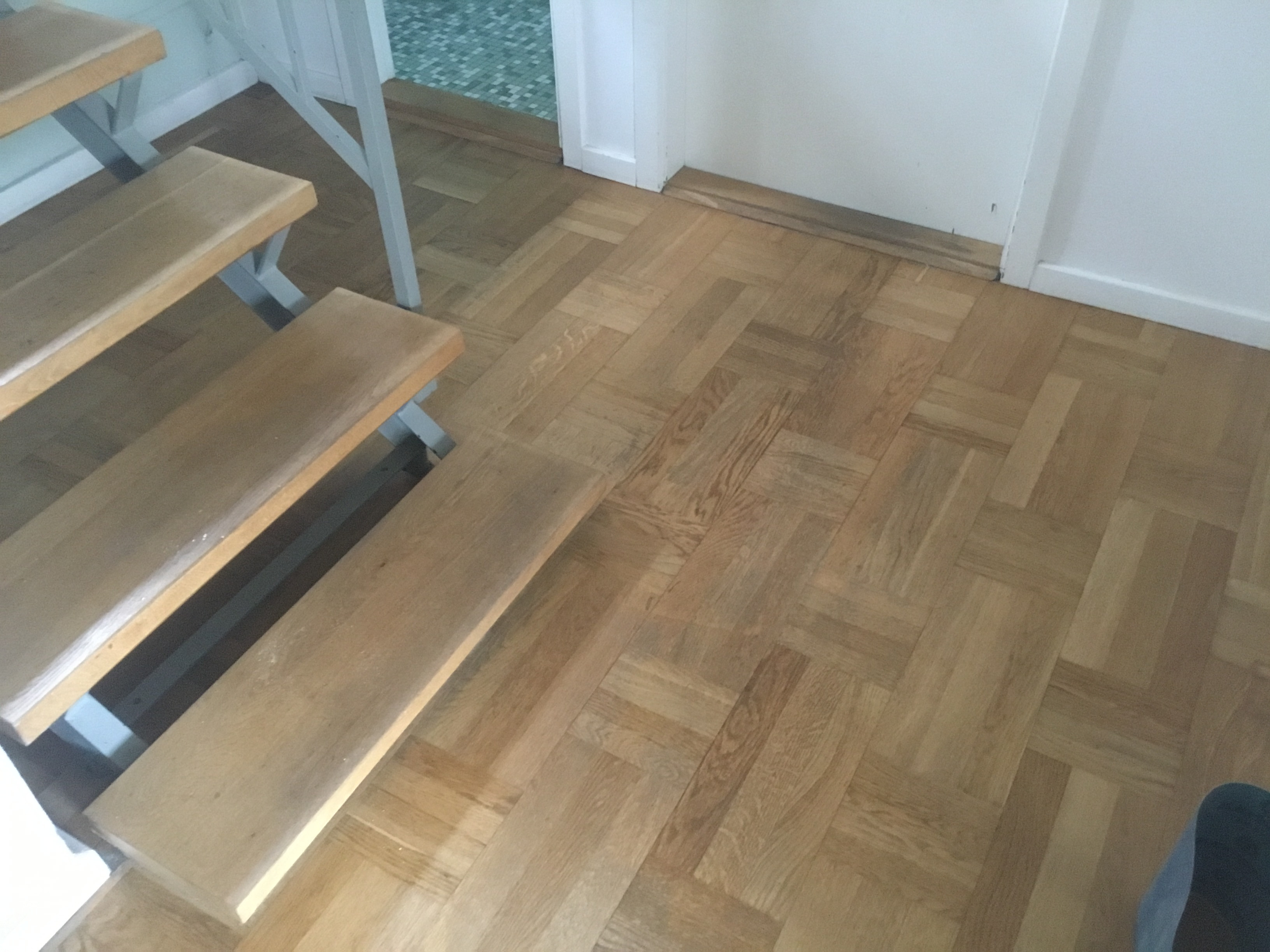 Vi har fået foretaget gulvafslibning og overfladebehandling på gulv 1. sal ( se foto) og trappe til 1. sal samt slebet og olie/voks behandlet køkkenbord og sofabord.