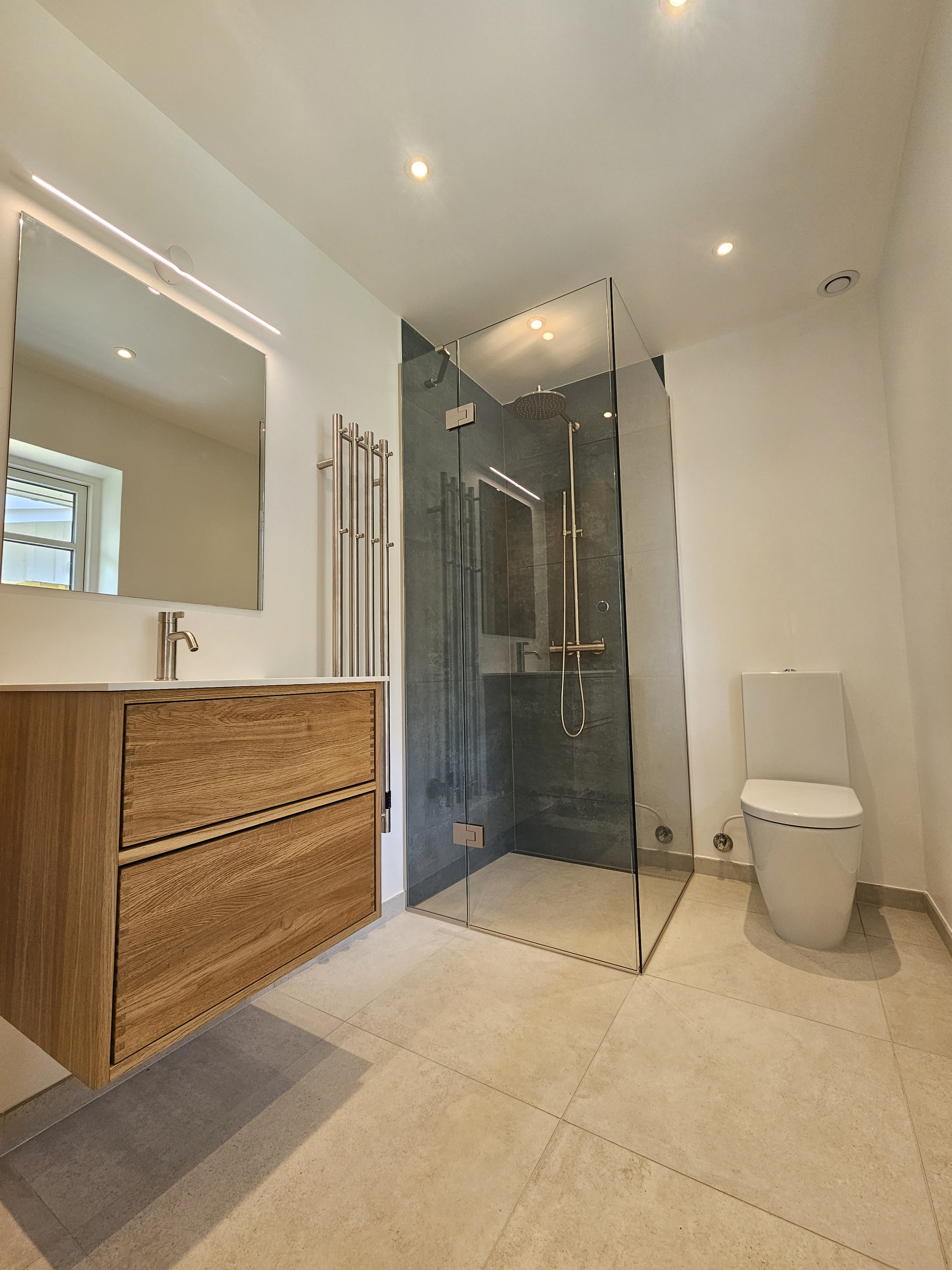 Patrick og holdet har lavet et super flot stykke arbejde med vores nye badeværelse. Det er blevet så flot. Vi har (naturligvis) stødt på udfordringer undervejs i processen, men Patrick har været god til at tage dialogen og hjælpe os videre.