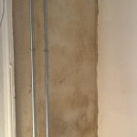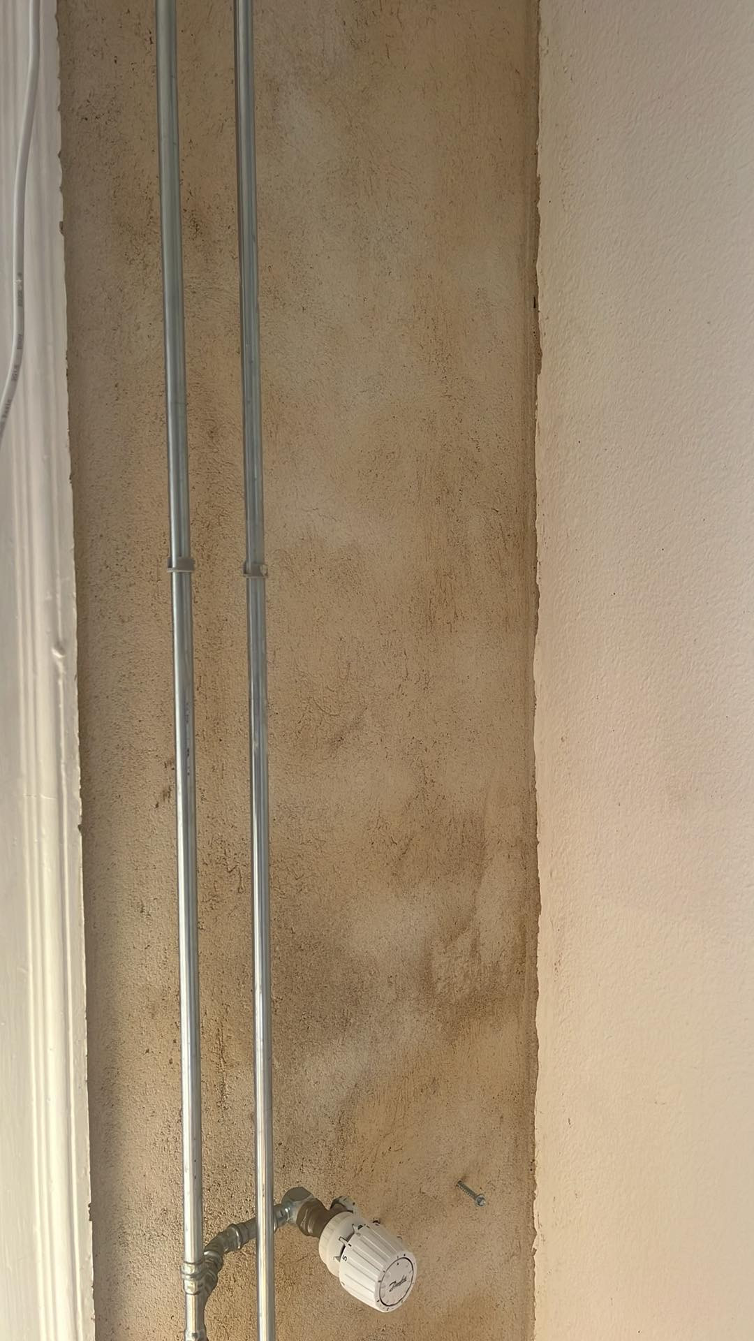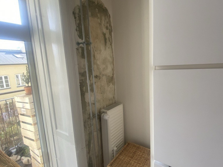 Afskallet puds på grund af vandindtrængning. De har holdt mig godt orienteret om forløbet, da jeg ikke var hjemme i 3 uger. SMS`er, mails og billeder.