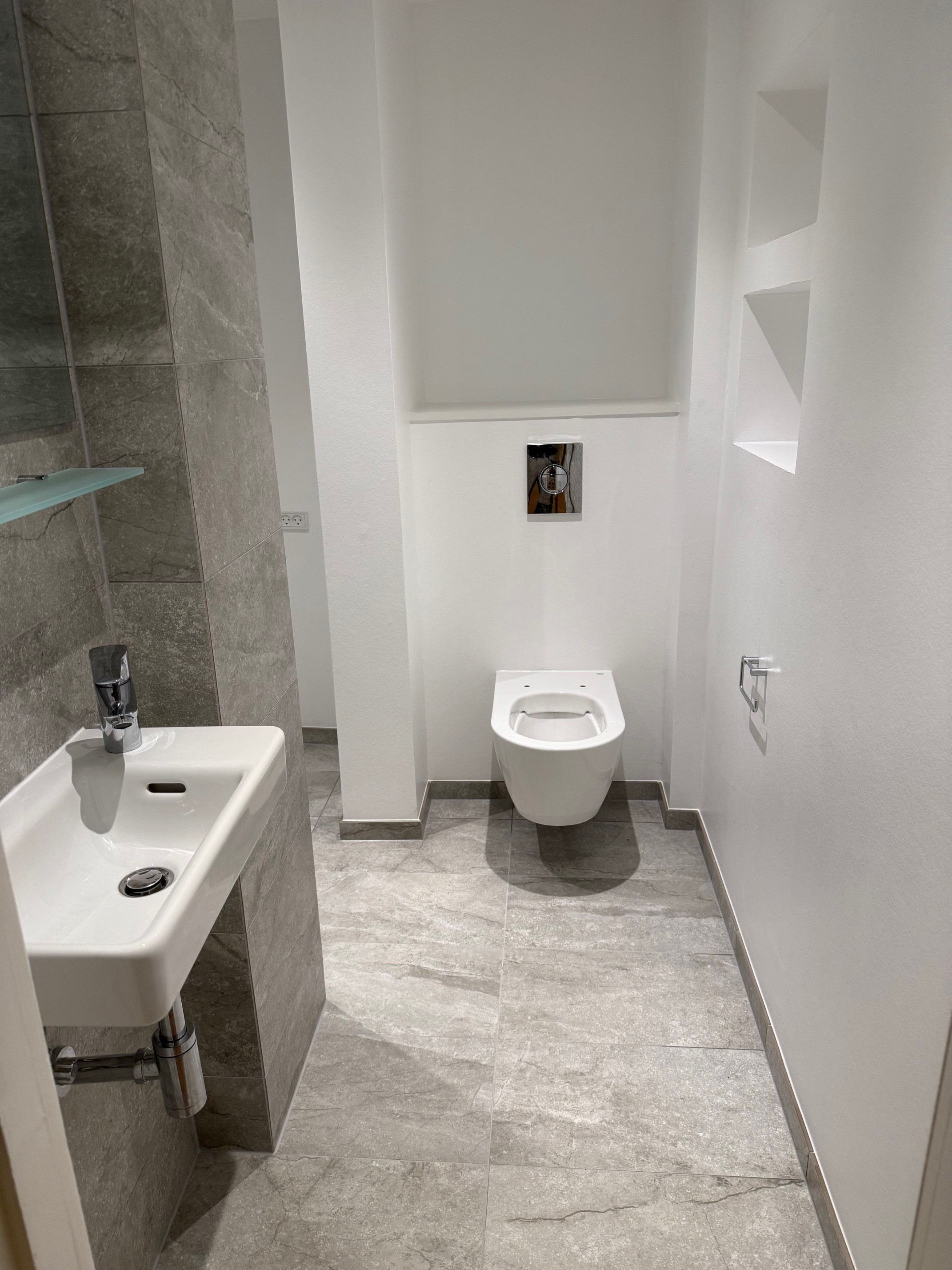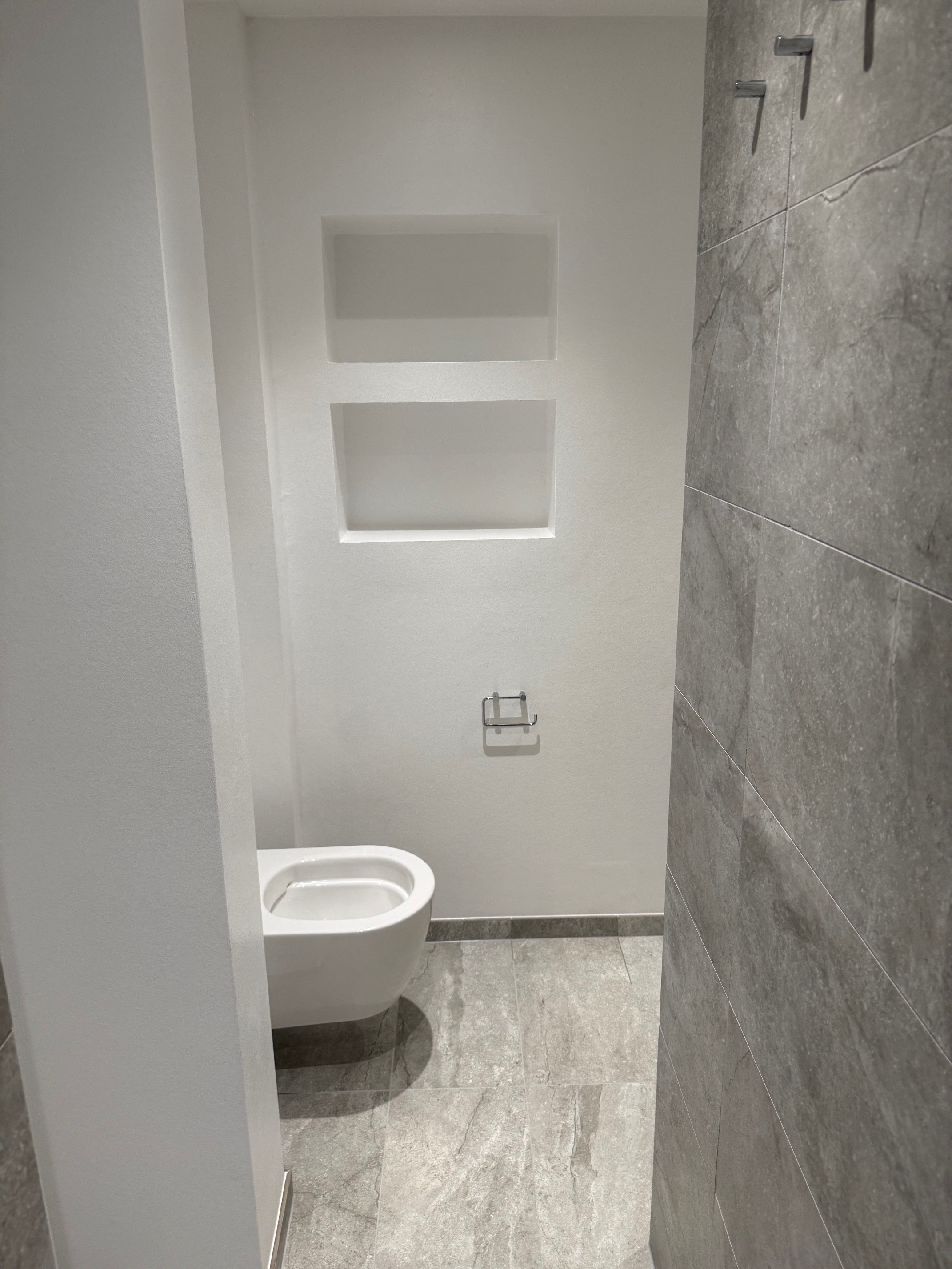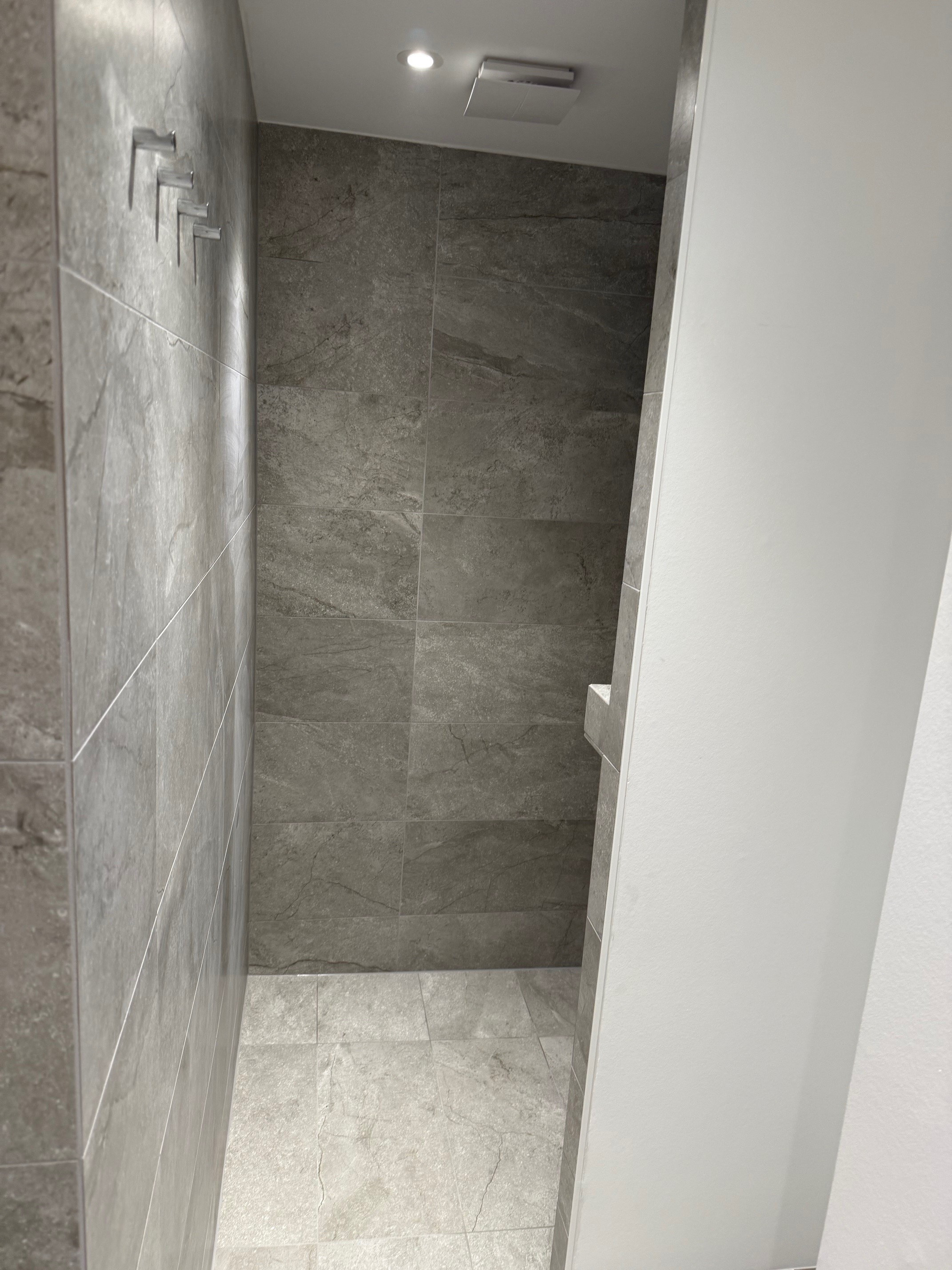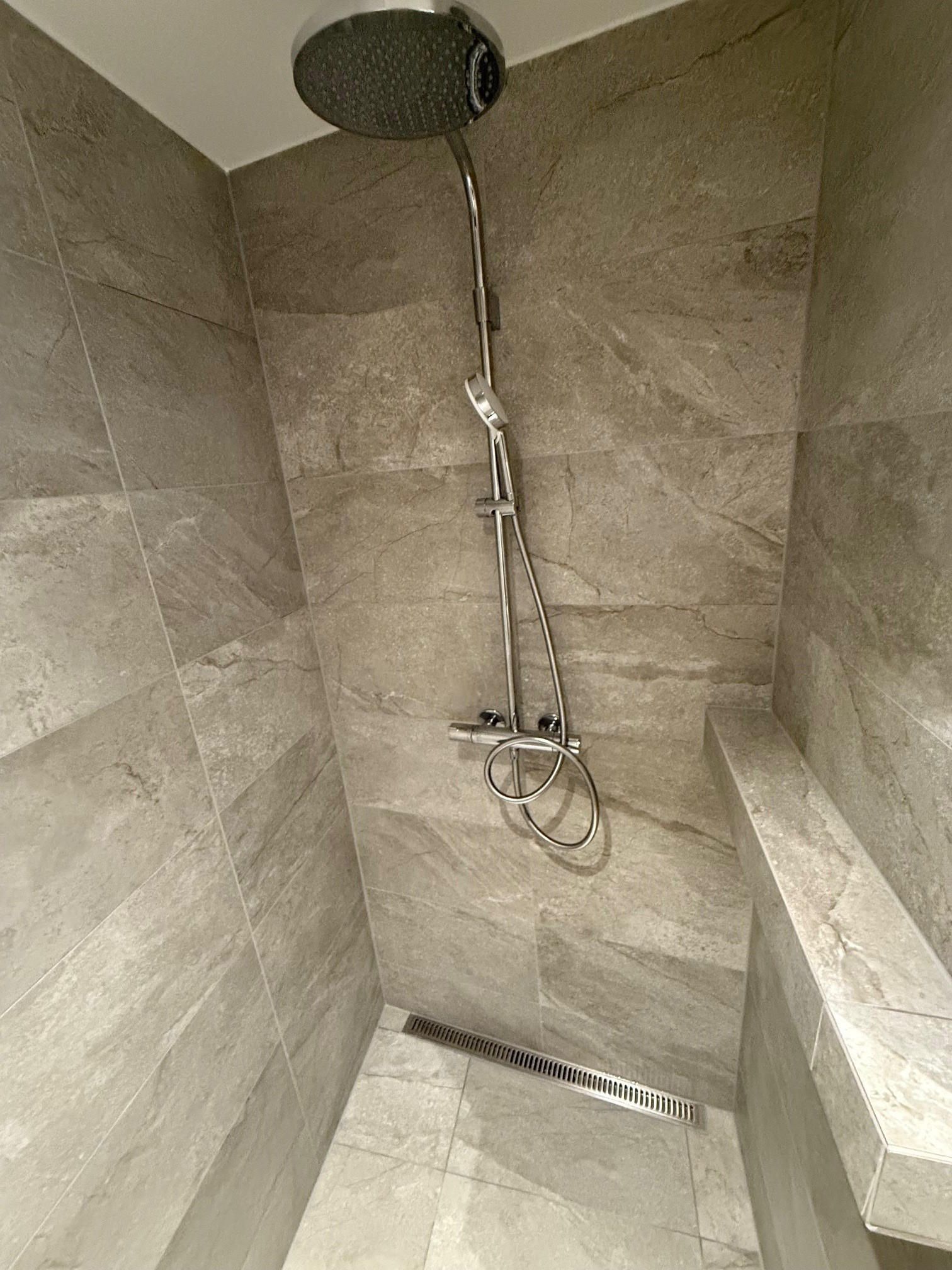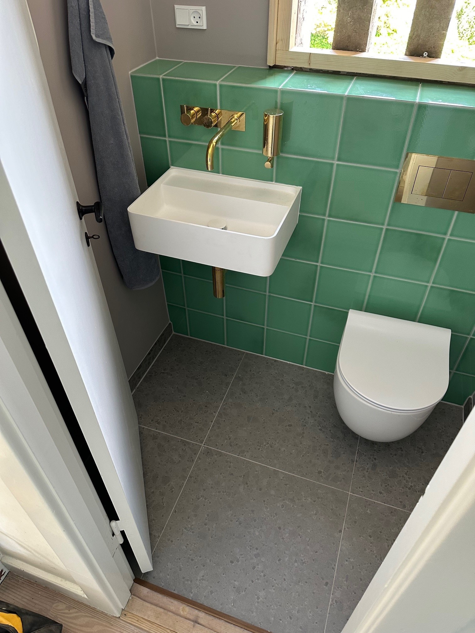 Resultatet taler for sig selv: fliserne er lagt perfekt, kanter og fuger står skarpt, og finishen er i top. Vi kunne ikke være mere tilfredse med badeværelset, der nu fremstår både stilrent og funktionelt. Morten har et godt øje for detaljer og en passion for sit håndværk.
