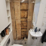 Morten har fjernet et gammelt flisegulv i badeværelset, lagt ny membran og fliser, og har koordineret entreprisen hvori vi også fik skiftet håndvask og ventiler.