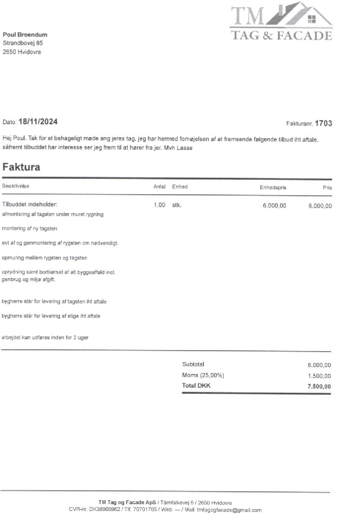 ud over det. så vil jeg minde dig om, at vi os har haft tid med at hente materialer, købe materialer, udfører opgaven, på genbrugs pladen det betaler vi os for som virksomhed. samt brændstof mm. - dit tilbud på 5000kr ex moms var inkl alt arbejde , kørsel , materialer, mm.