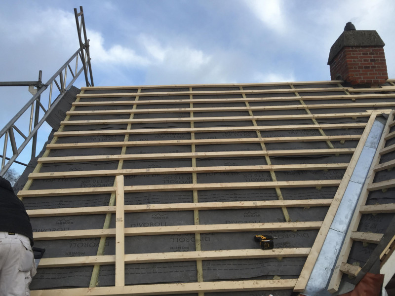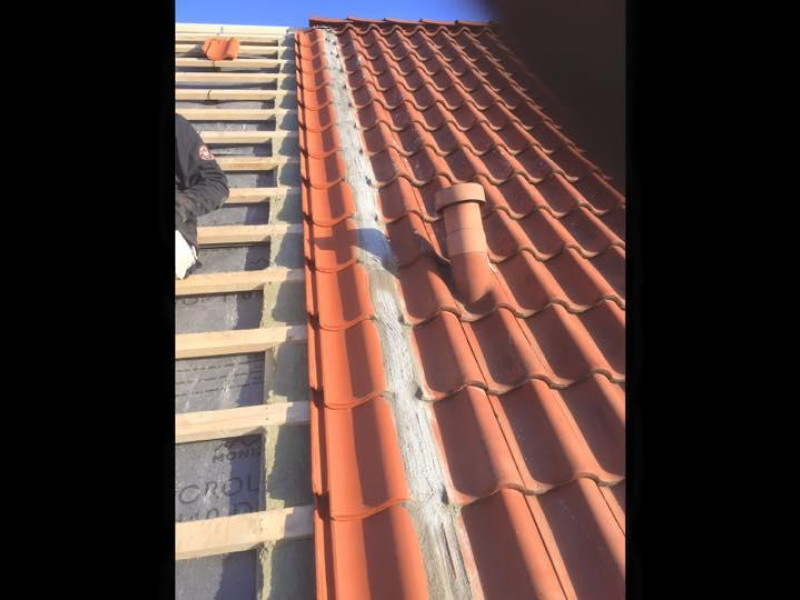 Rygningssten afmonteret, så den nye tagsten kunne komme på plads efter at være afkortet til korrekt længde. anbringes, Herefter blev rygningsstenen lagt på plads igen, og det hele afsluttedes med et pænt lag mørtel på begge sider af taget. Glimrende arbejde!