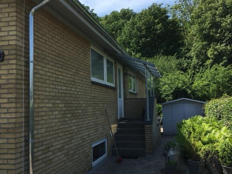 Arbejdet blev udført som aftalt. Murerens vej til tagtoppen skete via en 6 m lang stige til tag over altanen, og derfra op til tagets top via tagets lægter(tagsten afmonteret).