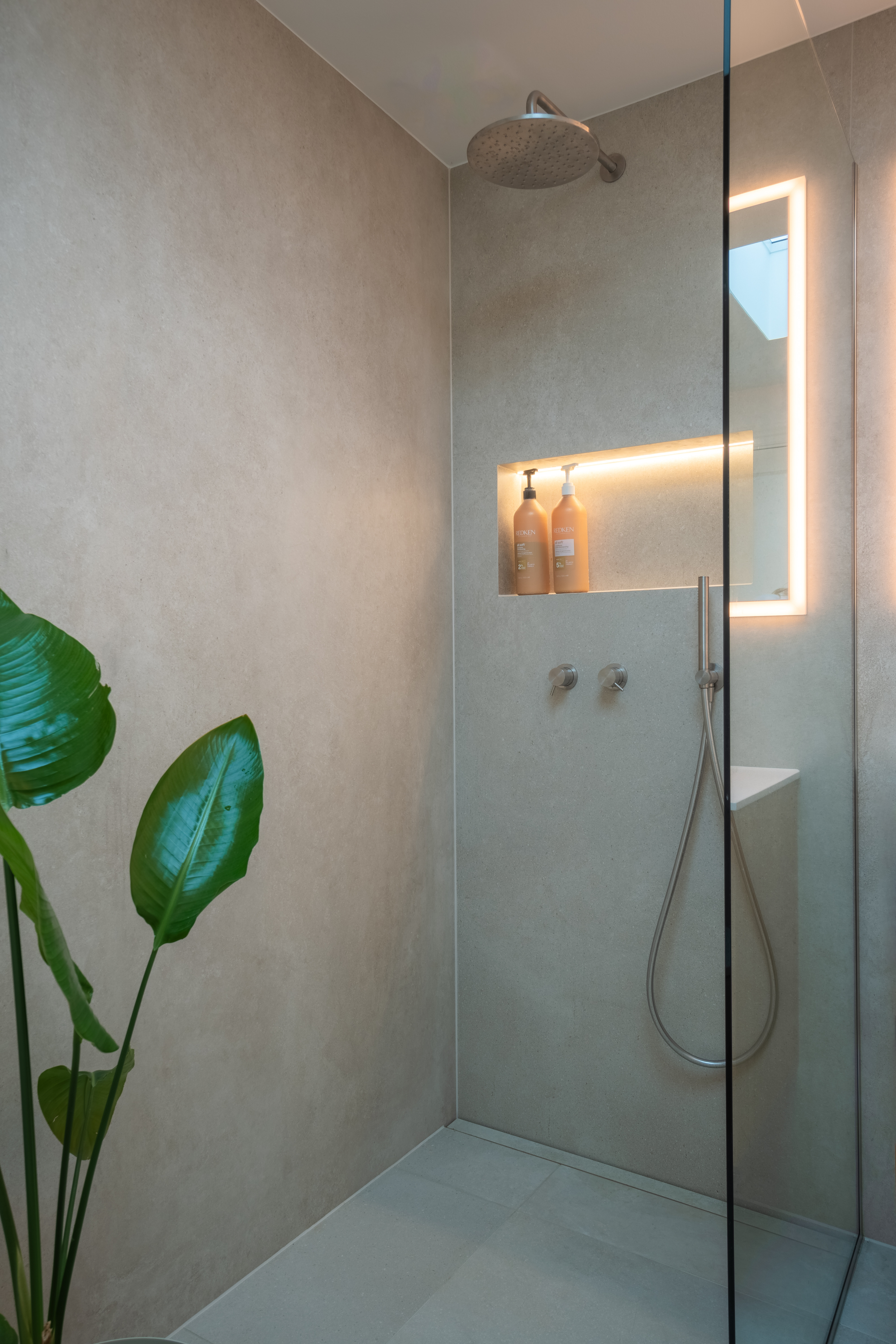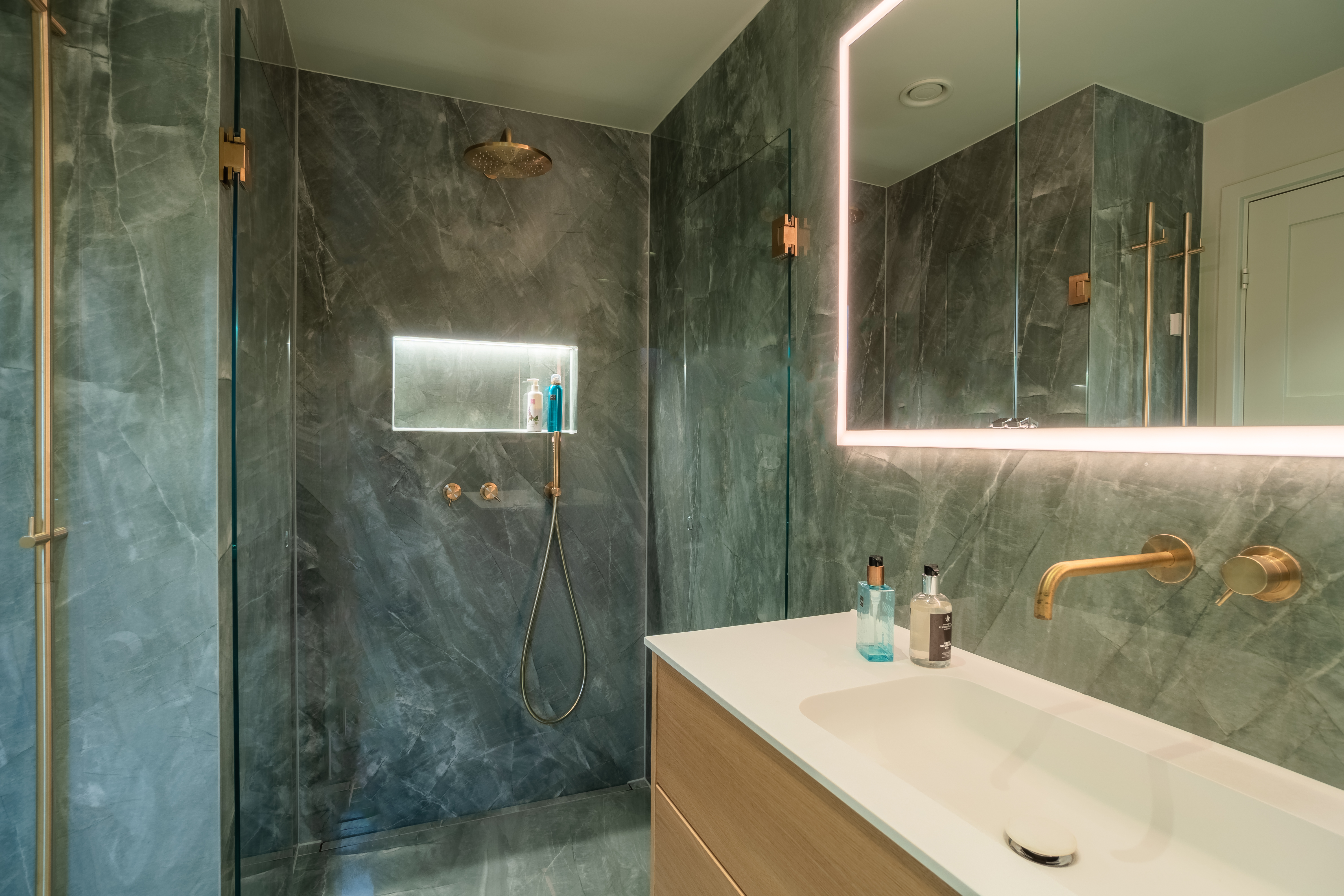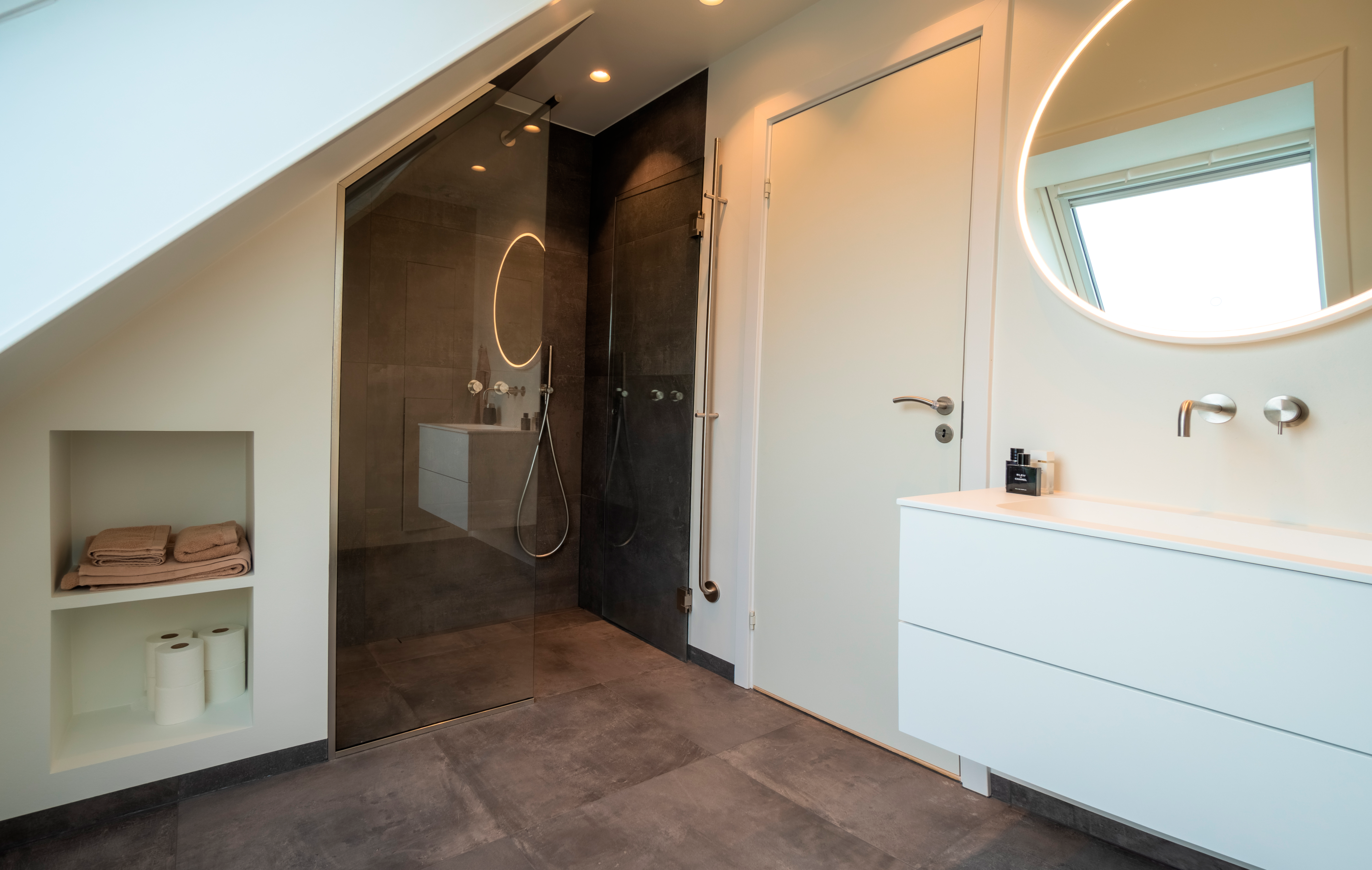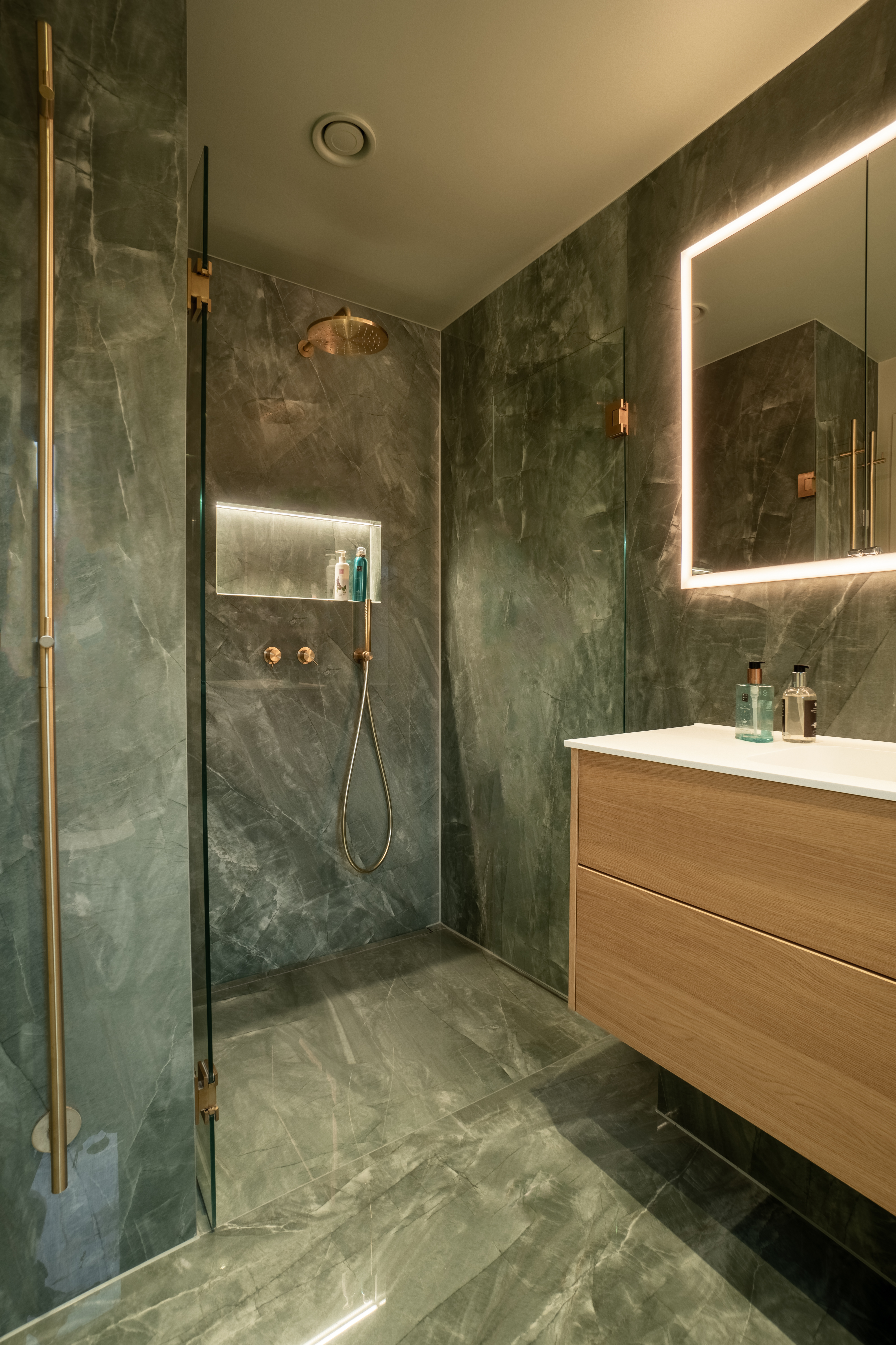 Først og fremmest er badeværelset udført i ekstremt højt kvalitet og med stor kræsen for detaljerne: Alt sidder snorlige og løsningerne med den indbyggede og oplyste shampoo-hylde eller de indmurede sokler er med til at give en følelse af et absolut premium murerarbejde. Jeg vil kraftigt anbefale kunder der ønsker et badeværelse ud over det sædvanlige at tjekke andre af Önders arbejder på de sociale medier, da det giver et rigtig godt billede af hvor flot et arbejde han leverer. Vi kunne ihvertfald ikke ønske os mere.