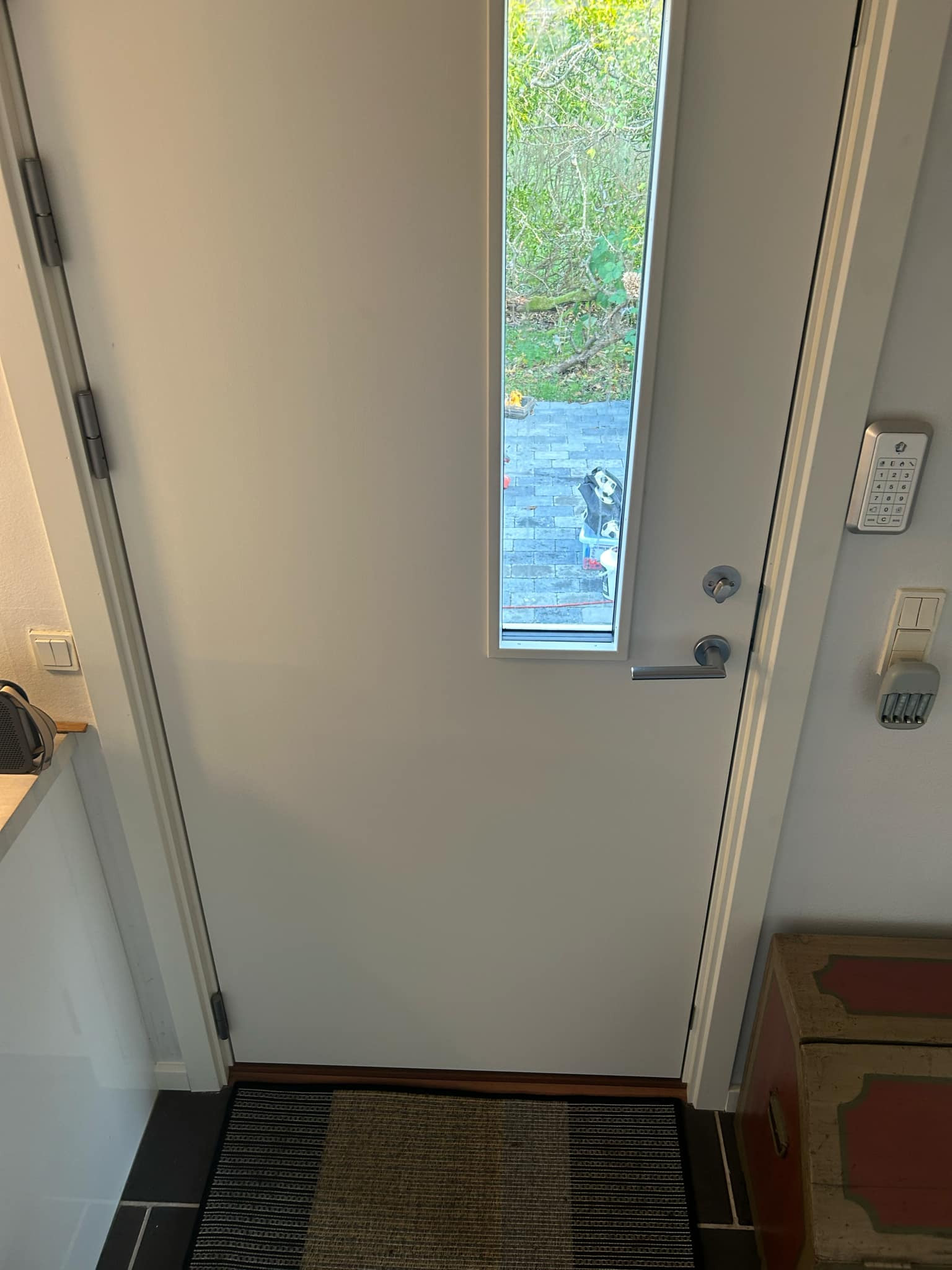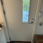Tømrersvenden kommer som aftalt om morgenen med det nye dørblad og konstaterer, at de eksisterende dørhængsler ikke kan bruges. Han kører i byen for at købe nogle nye plus en låsekasse, som han monterer. Til sidst fæstner han en smal liste i den ene side af dørkarmen, da det viser sig, at døren ikke dækker hele døråbningen.